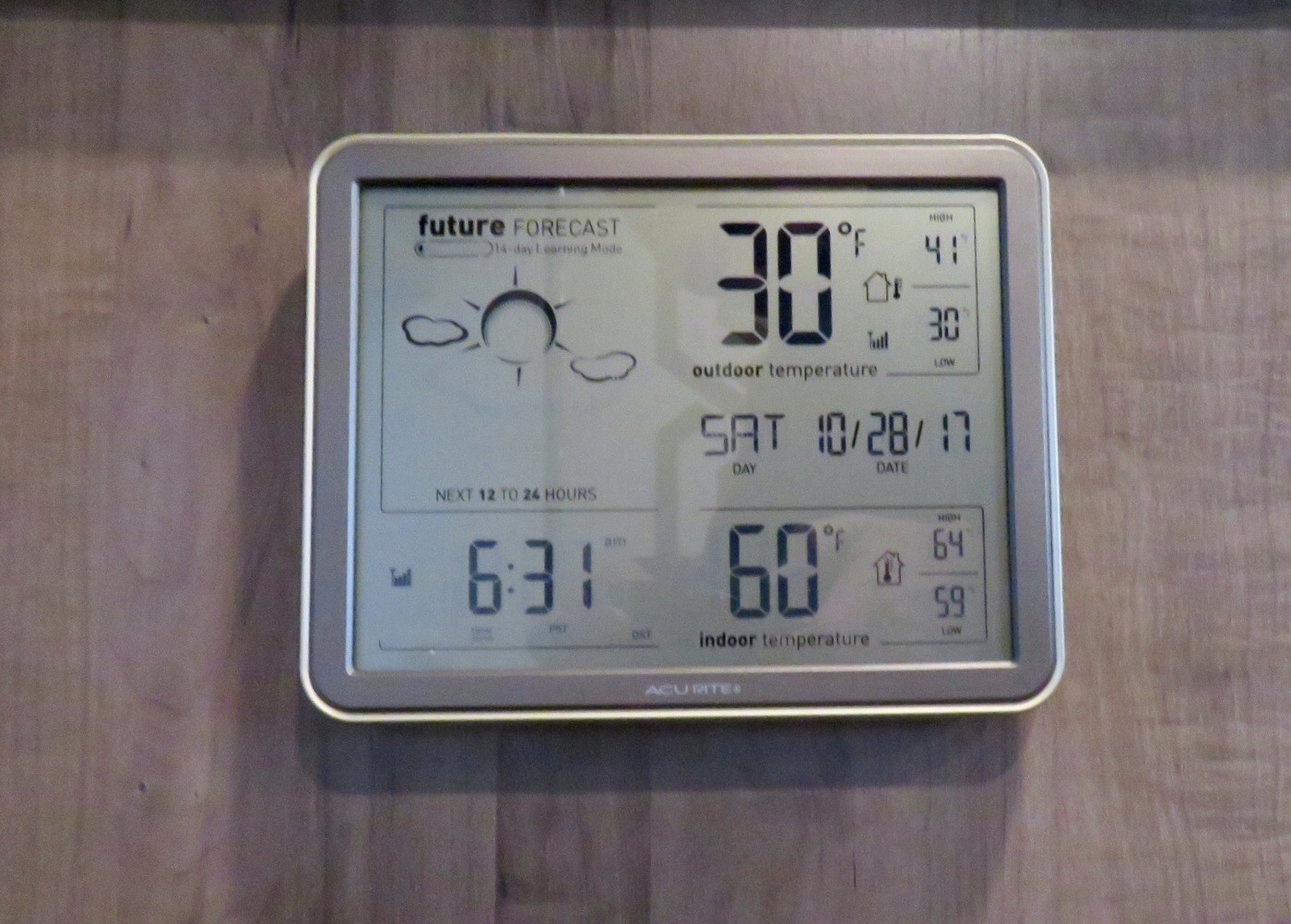 We were a little road weary and snappish. Feeding the dogs is always a big pain in the ass. Cali is bone thin, but getting her to eat is like pulling teeth and PJ gets really agitated. She’s also figured out that we were slipping her meds into cheese balls and now she won’t eat them, so it’s back to the old fashioned push it to the back of the throat method. No fun. We chilled out and ate some salads and watched a few innings of the World Series. The heaters been getting a good trial run so far. I also switched on the tank heaters and ran the water heater all night to avoid anything freezing. Hope to avoid any poosicles 💩. I set up our inside/outside weather station so we could monitor the temperature. Dad and Sandy had given us one that we used in Lexi and we really liked it, so we got the same one for Wilson.