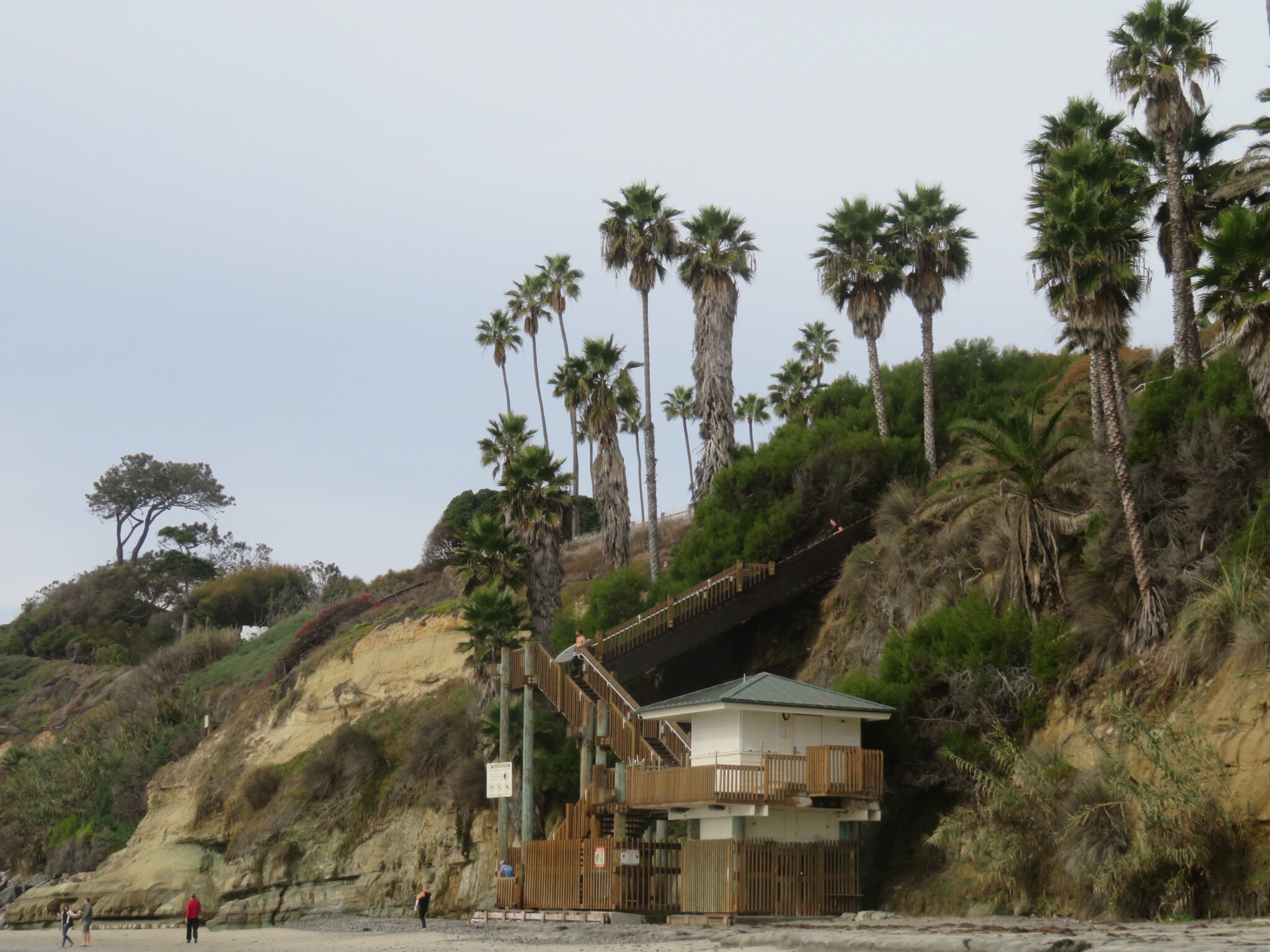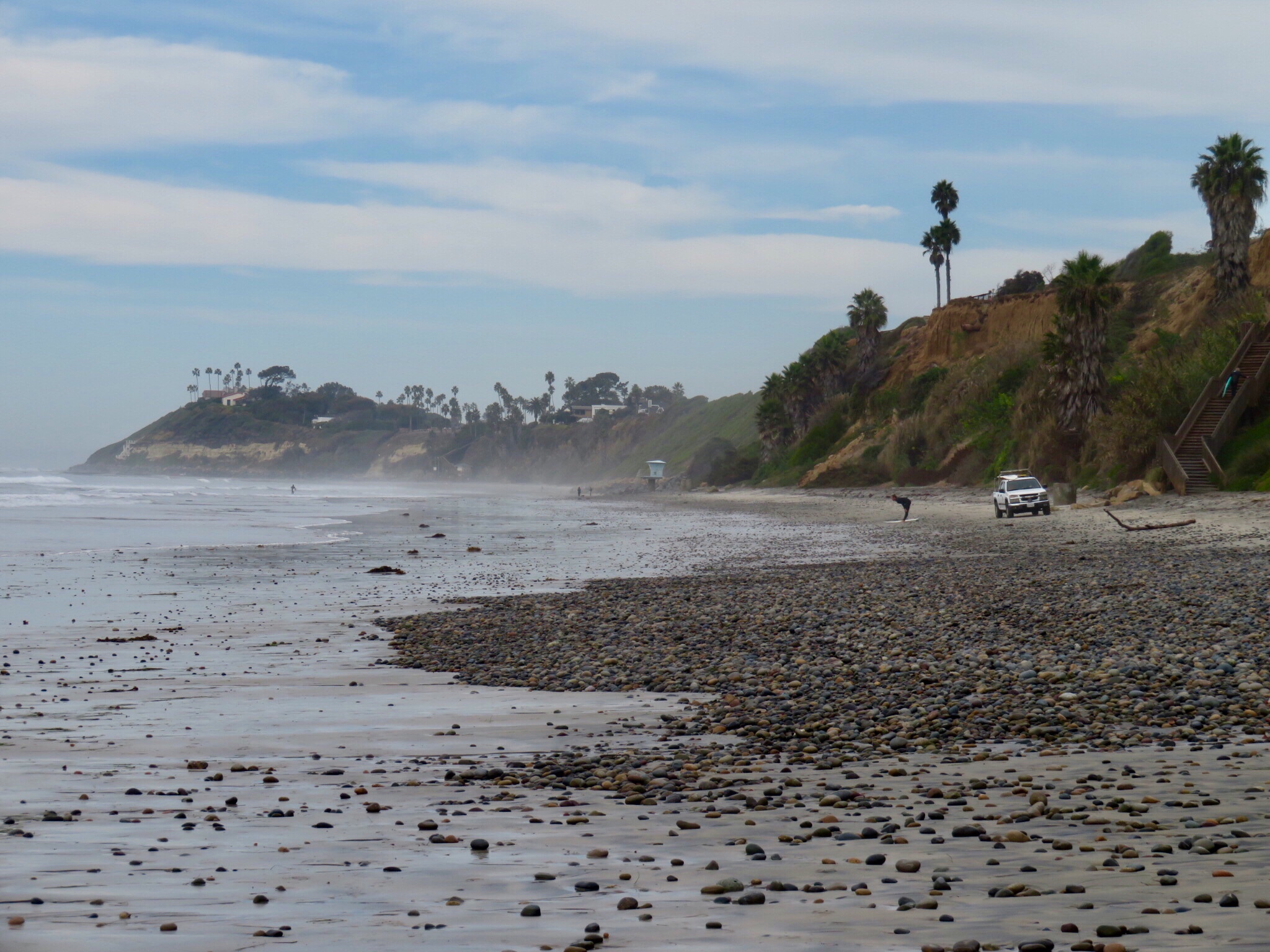 After dining bluffside on a mushroom and cheese scramble that I’d concocted, we decided to walk down the beach to Swamis and see what there is to see. We walked along the sand watching the surfers trying their luck at all of the breaks along the coast. A hawk was circling overhead crying out every so often to let you know who the king of the sky is in these parts.