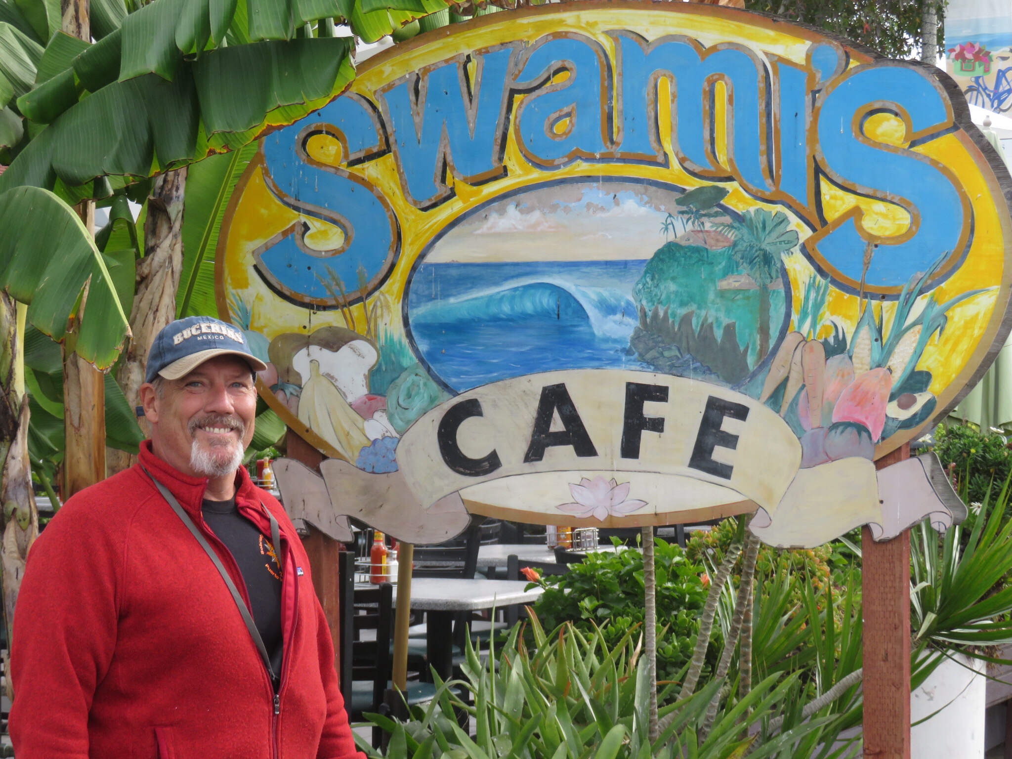 It was close to 2:00 so lunch was on our minds as we walked down the block and crossed the coast highway to order up some organic grinds at the Swamis Cafe. We relaxed on the patio watching traffic roll by and checking out the guys setting up the holiday lights on the SRF temple across the road. The food was excellent. I think we enjoy Swamis Cafe’s cuisine almost as much as the local birds do.