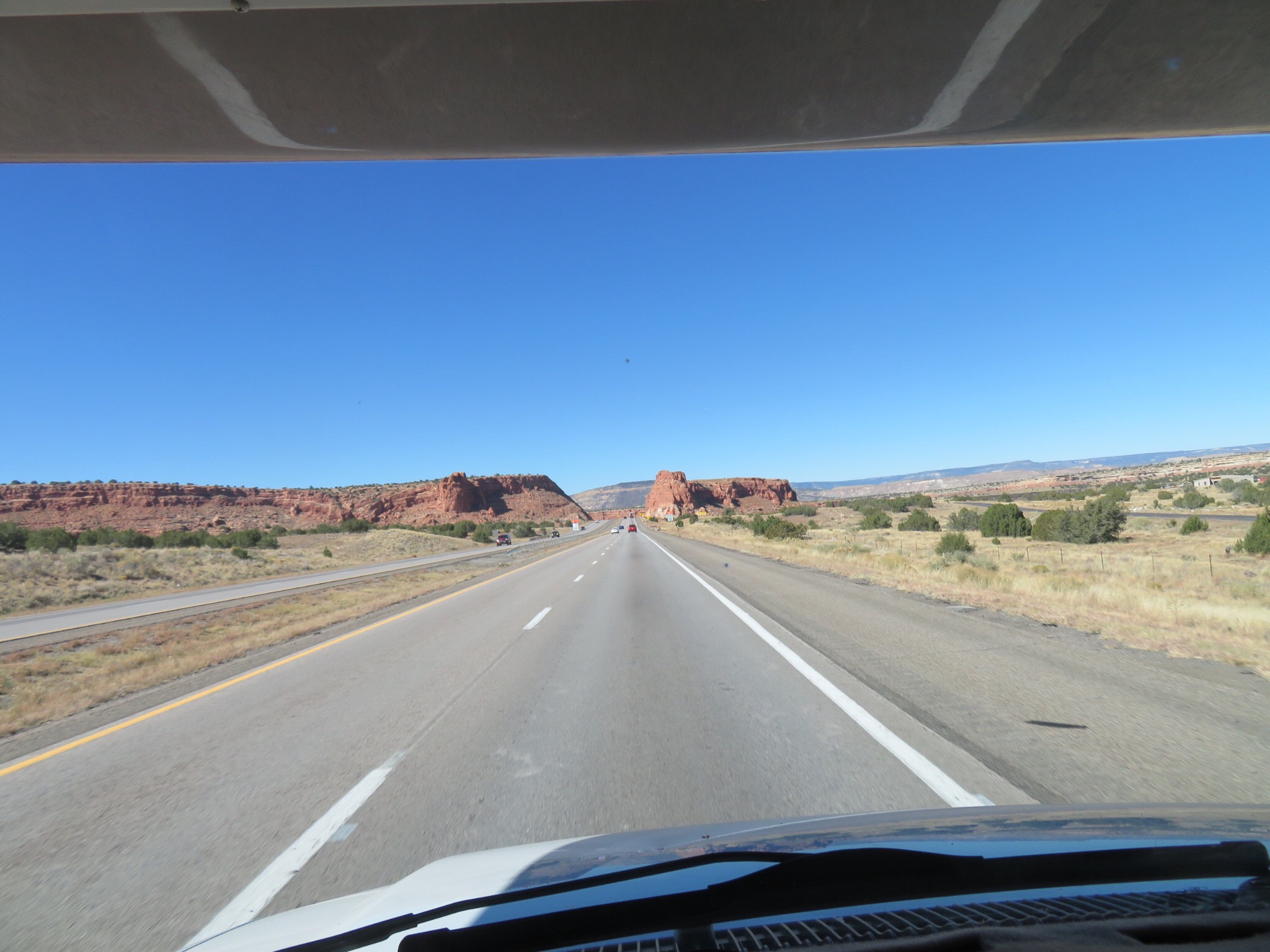 The wind was a steady 35 mph with gusts up to 60. It was full focus, death grip driving. There were quite a few other rigs out determined to get to where they were heading. The trucks were weaving all over the place also, not slowing a bit for the unsafe conditions. We stopped a number of times for bathroom breaks and to give my arms a rest. The armrests on the Ford cab are a little low so they don’t provide much relief and the outside shoulder area gets sore after some time driving. Worked our way through Albuquerque an on into the badlands to the west.