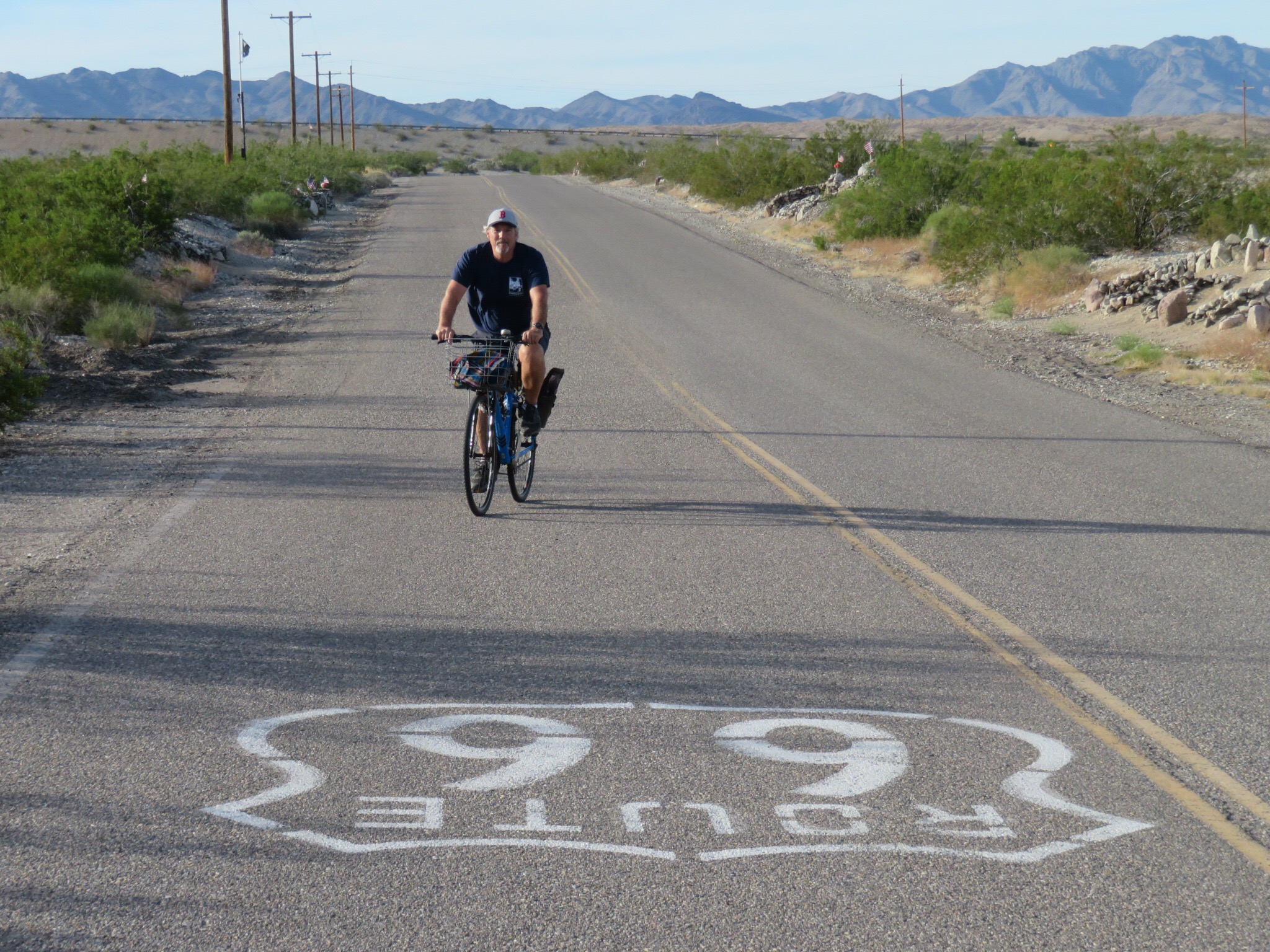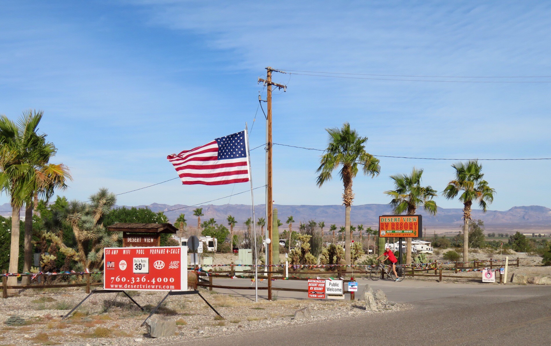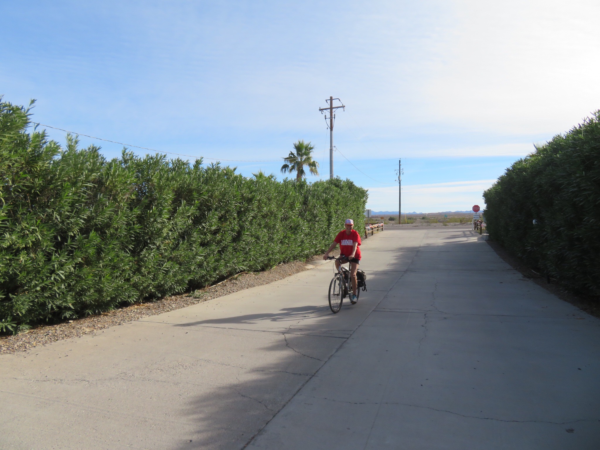 After lunch today, we rode our bikes over to the nearby KOA, the closest place with a small market to buy supplies. We got a few gallons of drinking water and a large can of chicken breast pieces to supplement the dogs’ dinner. We brought it back and dropped it off then took off for a pedal around the quiet desert road we are located on. We ran into our new bro’ Sandy from Alberta who was out for a hike through the scrub to clear his head. We paused to chat for a few minutes then resumed our trek.