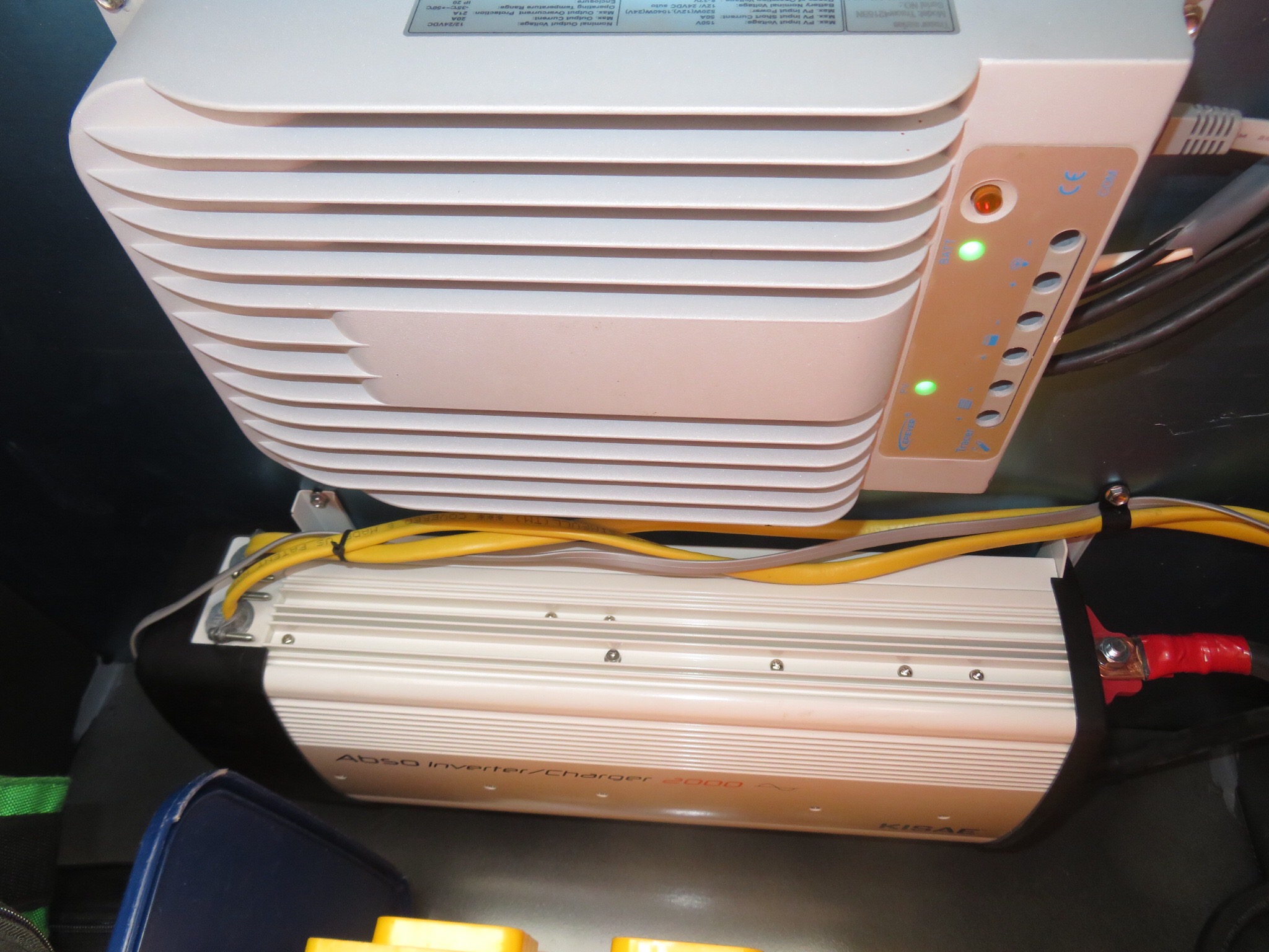 We pulled into The Sun Works about twenty minutes late, but no one seemed too worked up about it. People on the Slabs, for the most part, appear pretty laid back. The first thing that was apparent was that the Magnum inverter we wanted to install wasn’t going to fit into the door side storage bay where I had thought to put it in. We went over some options and it would fit under the sink, but I wasn’t too keen on putting it there. In the end, I opted for a different unit, a cheaper Chinese model that Mike has been using without any issues. It has good reviews and since I’m not the full time boondocker, I decided to give it a shot and see how it works. I’ll post a review after some time goes by. It’s a Kisae 2000W inverter charger, about $600 less than the Magnum. We paired it with a Tracer 4215 BN charge controller, not so much to save a few bucks over the Blue Sky, but due to the fact that it has capacity to add more panels later on and the boys are impressed with its solid construction and large heat sink design. We mounted them upside down in the storage bay by the door adjacent to the batteries that are located under the steps.