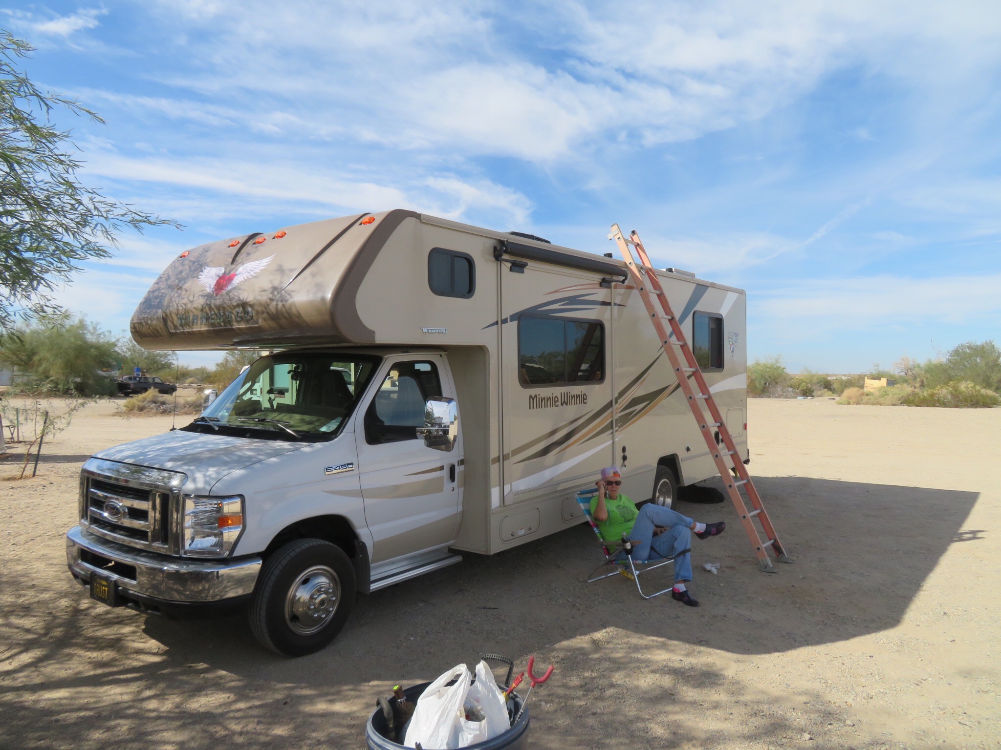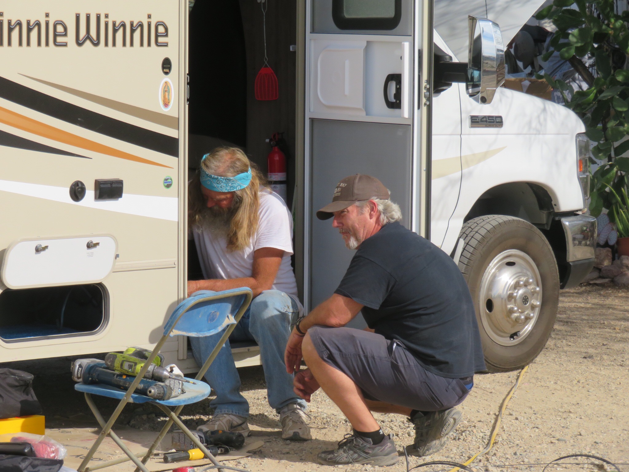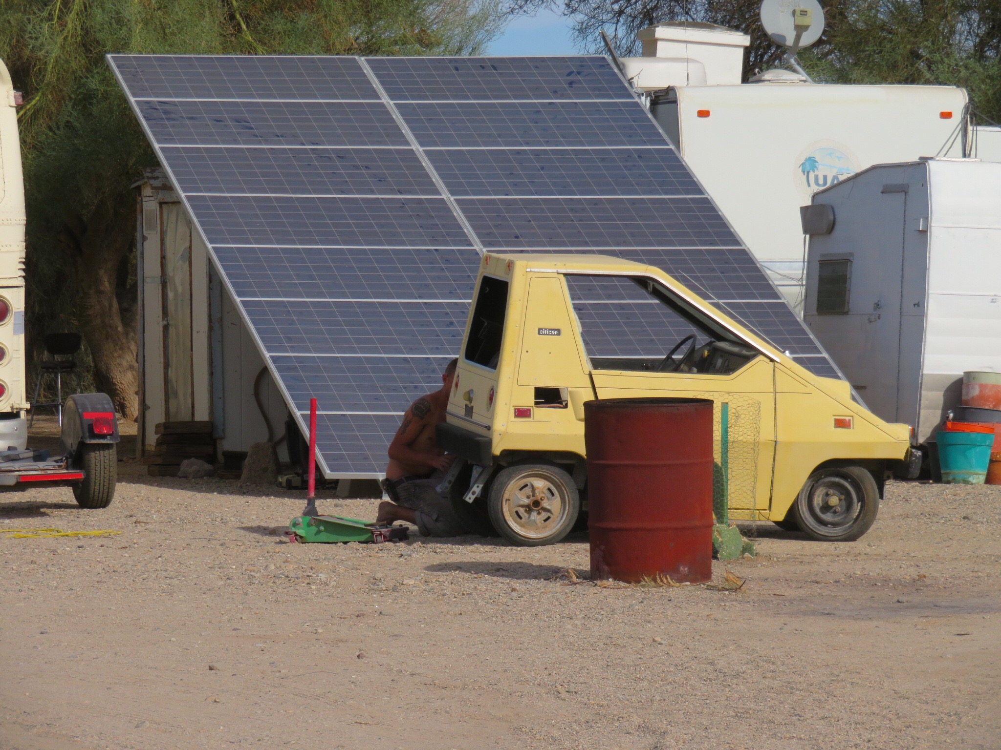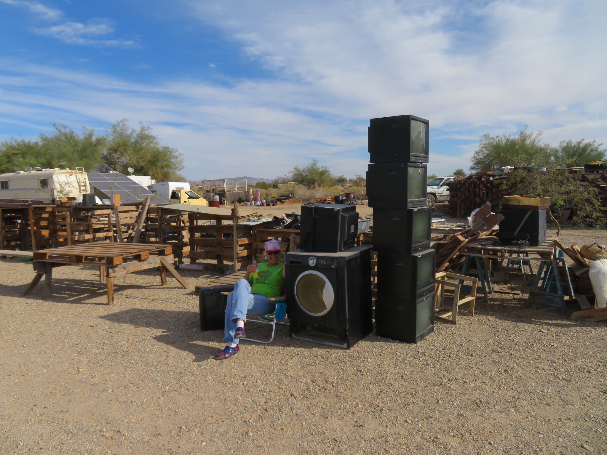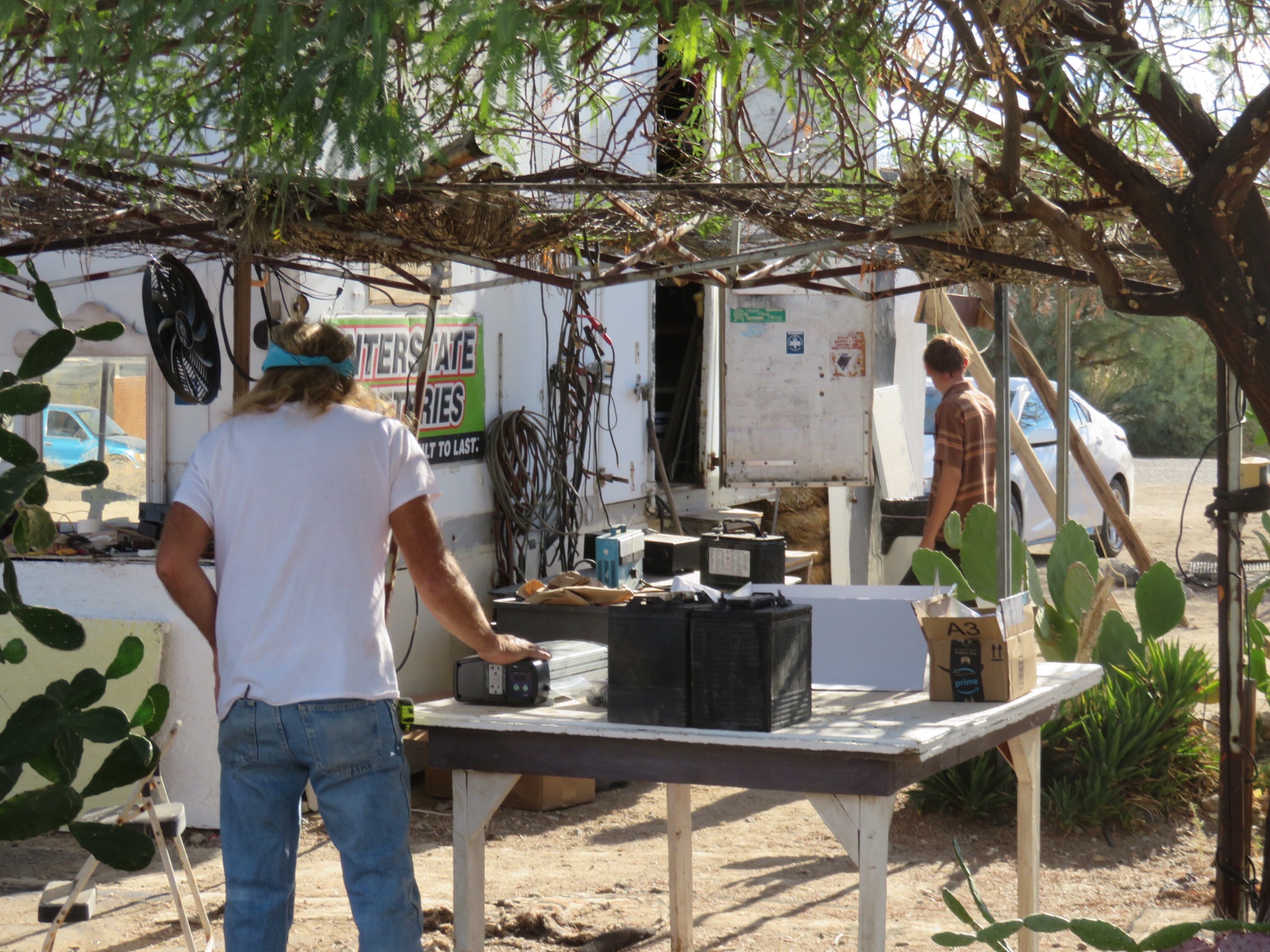 A colorful cast of visitors came and went, some picking up solar supplies, others just saying hello. Mike goes out of his way to support the community and finds odd jobs and clean up projects for those most in need of a few dollars to get them by. He supplies a solar charging station where the Slabsters can come and plug in their devices while sitting in the shade in a recycled chair waiting to get charged up.