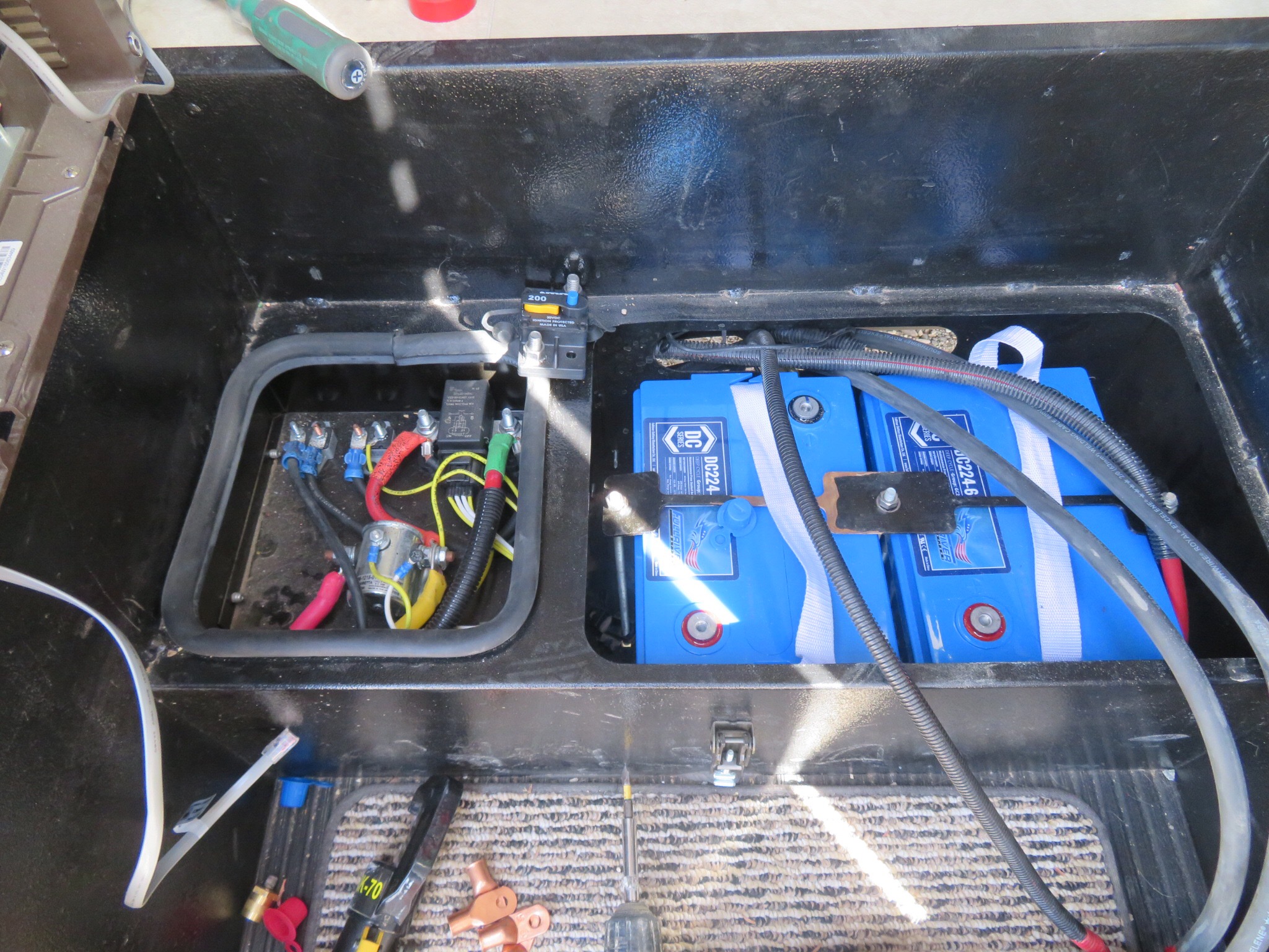 Billy got to work running the wiring while his son, Chance, climbed up on the roof and mounted the two 165W Everbright solar panels near the rear of the RV. Everbright’s another new product to me. Made up in Northern CA, they have a decent reputation and Mike’s been using them for the past year with no problems. With these, I can get away with running two panels in place of the three 100W panels that I had on the Lexington. Those will be powering two Fullriver 224 amp/hr. sealed AGM 6V batteries, yet one more product I have no prior experience with. Thought I’d shake it up and try the AGMs. Well, as the license plate says “TRUST”.
