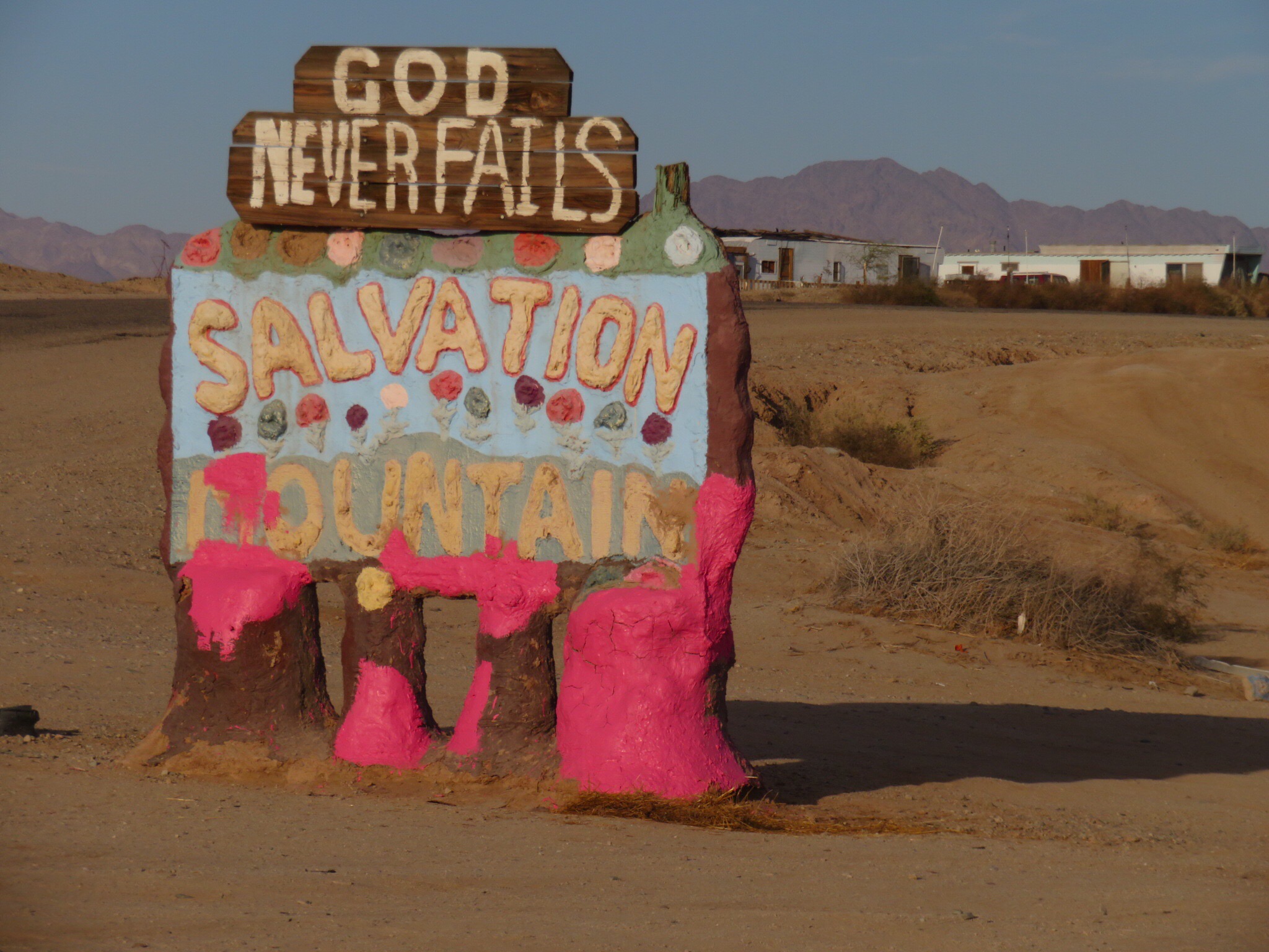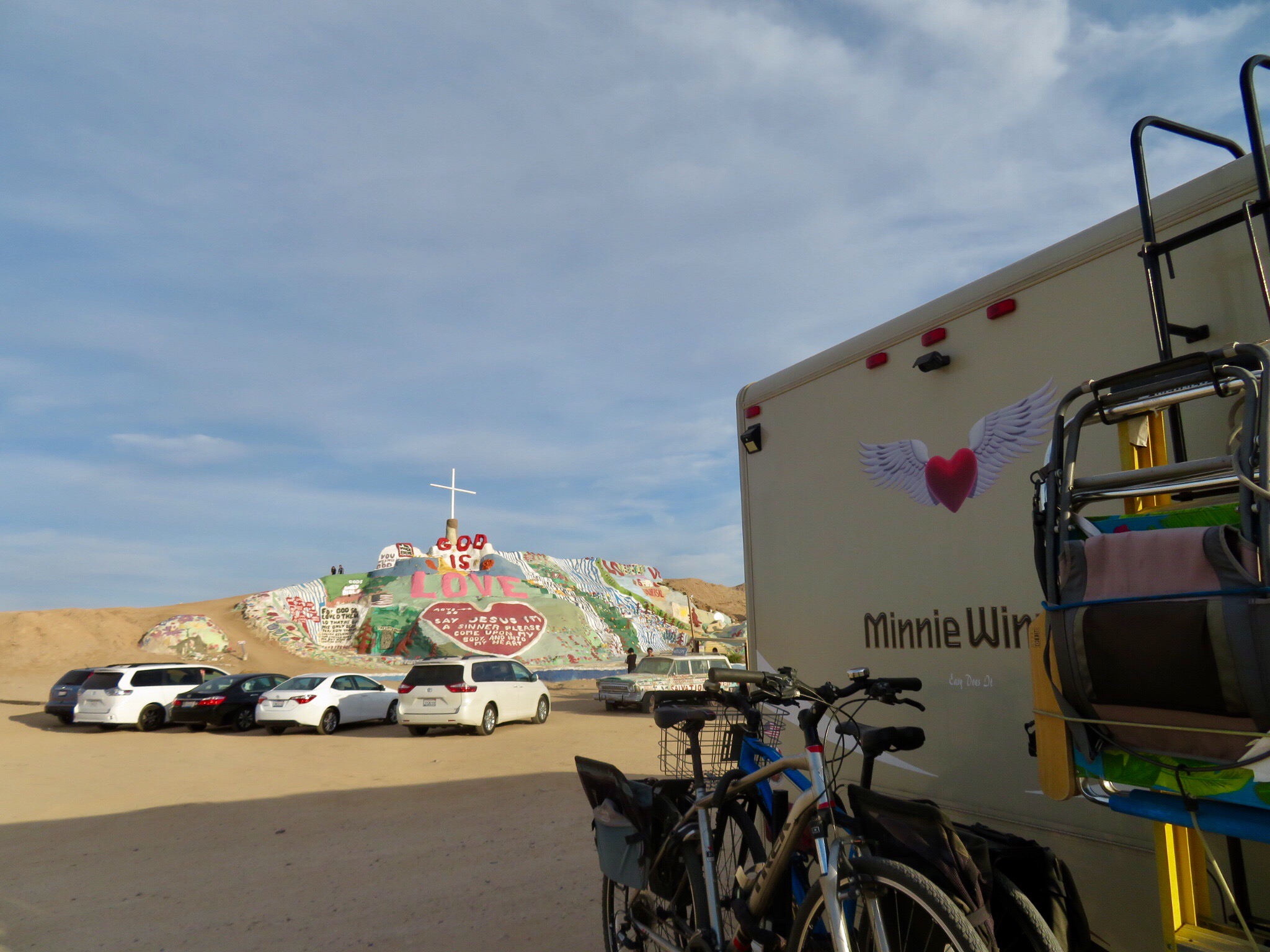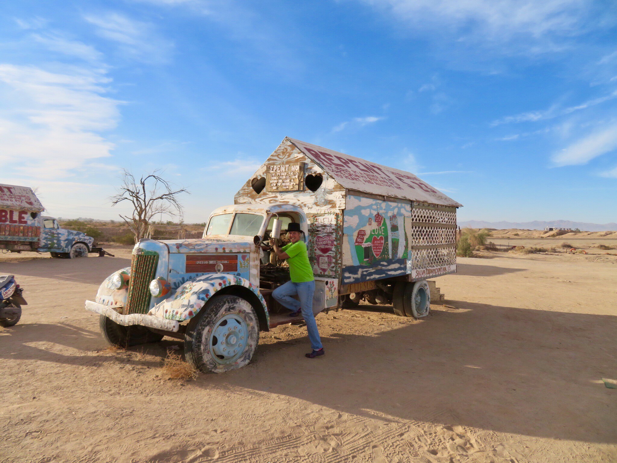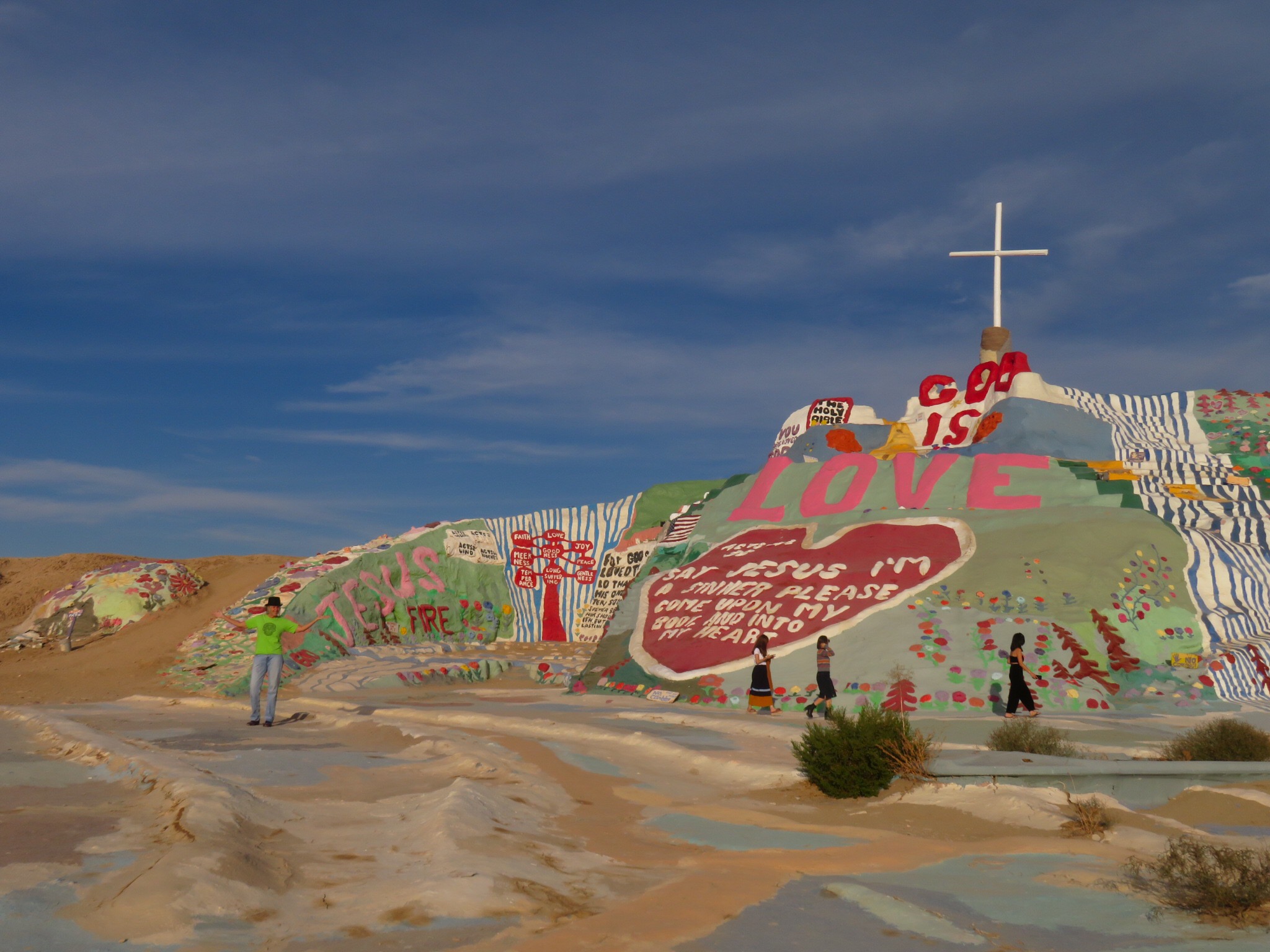 No visit to the slabs would be complete without a stop at Salvation Mountain, the large art installation at the entrance to Slab City. The passion and life work of the late Leonard Knight. Made of adobe, straw and buckets of donated paint, the monument stands out on the south side of the road as you drive by. We parked the RV and meandered around the sculpture for a while. There were car loads of Asian tourists wandering around the mountain snapping tons of photos. Must be in a prominent display in the latest guidebooks. I thought it was more of a local phenomenon but I guess Salvation Mountain has an international cult following. I googled and read online. In one post, someone asks if it’s okay to bring a dog. A helpful expert replies that yes, as long as you keep it on a leash and pick up after it. I’m like, ‘dude, this is Slab City, you could walk a walrus here and nobody’d blink an eye.’