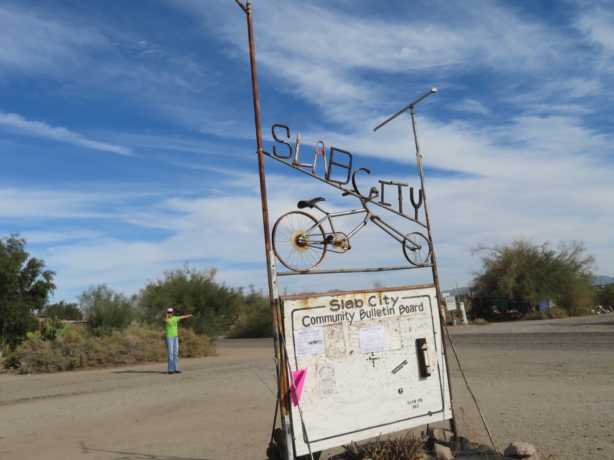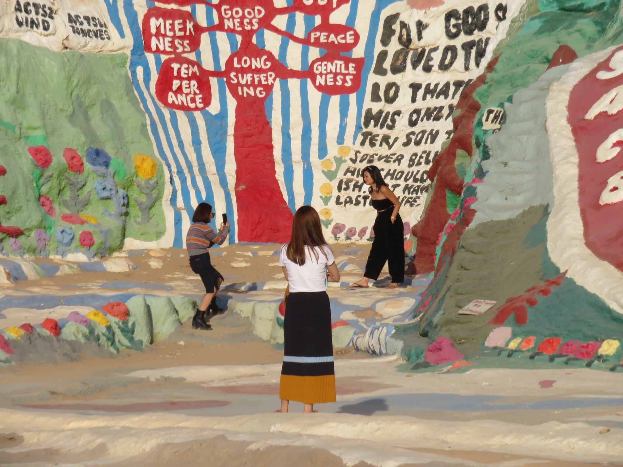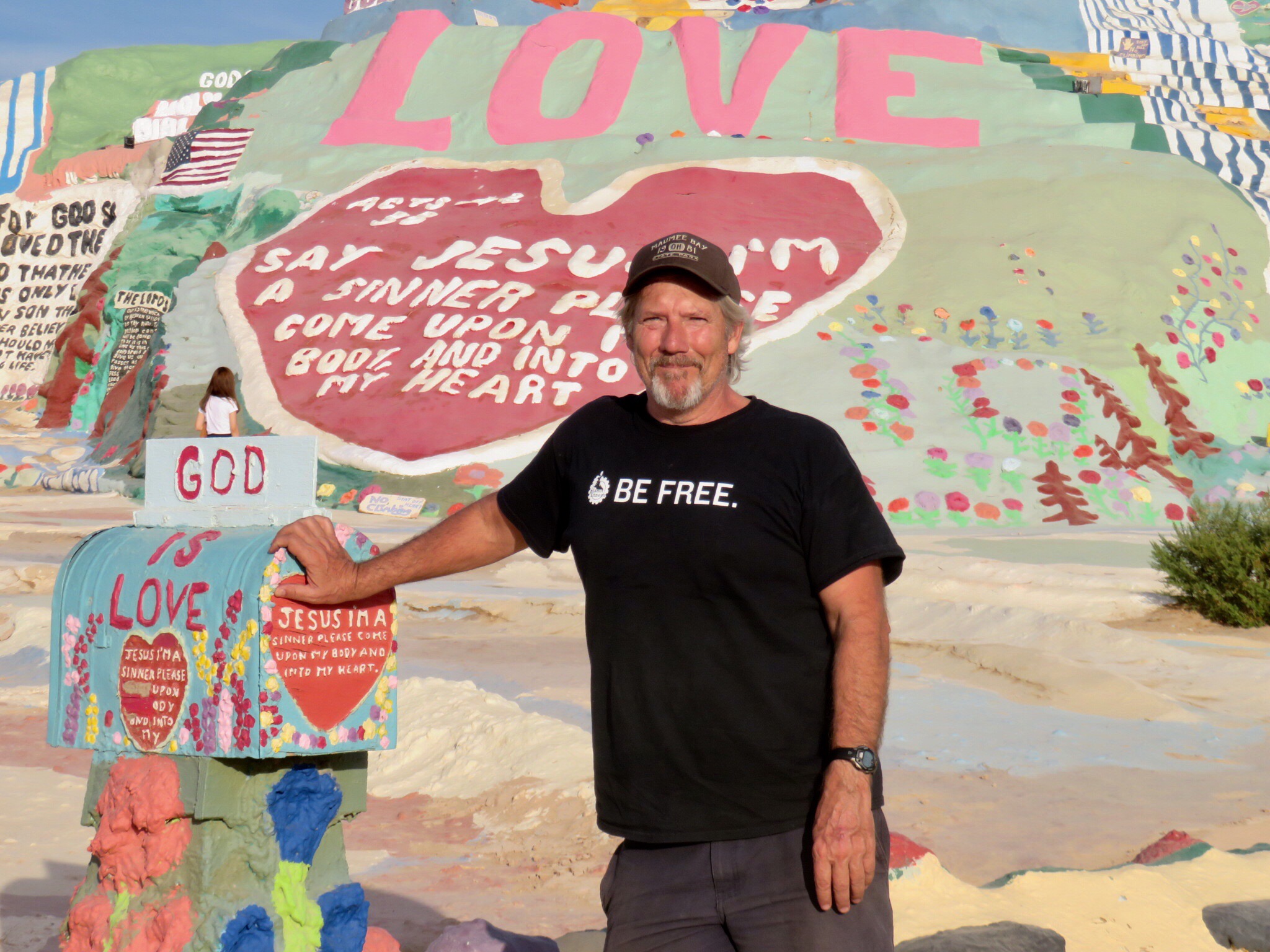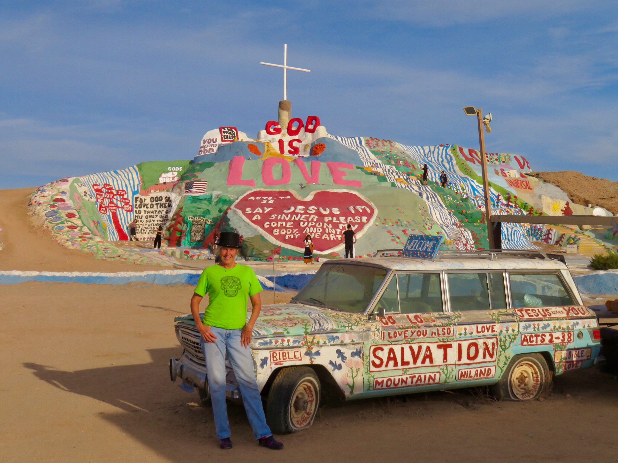 No visit to the slabs would be complete without a stop at Salvation Mountain, the large art installation at the entrance to Slab City. The passion and life work of the late Leonard Knight. Made of adobe, straw and buckets of donated paint, the monument stands out on the south side of the road as you drive by. We parked the RV and meandered around the sculpture for a while. There were car loads of Asian tourists wandering around the mountain snapping tons of photos. Must be in a prominent display in the latest guidebooks. I thought it was more of a local phenomenon but I guess Salvation Mountain has an international cult following. I googled and read online. In one post, someone asks if it’s okay to bring a dog. A helpful expert replies that yes, as long as you keep it on a leash and pick up after it. I’m like, ‘dude, this is Slab City, you could walk a walrus here and nobody’d blink an eye.’