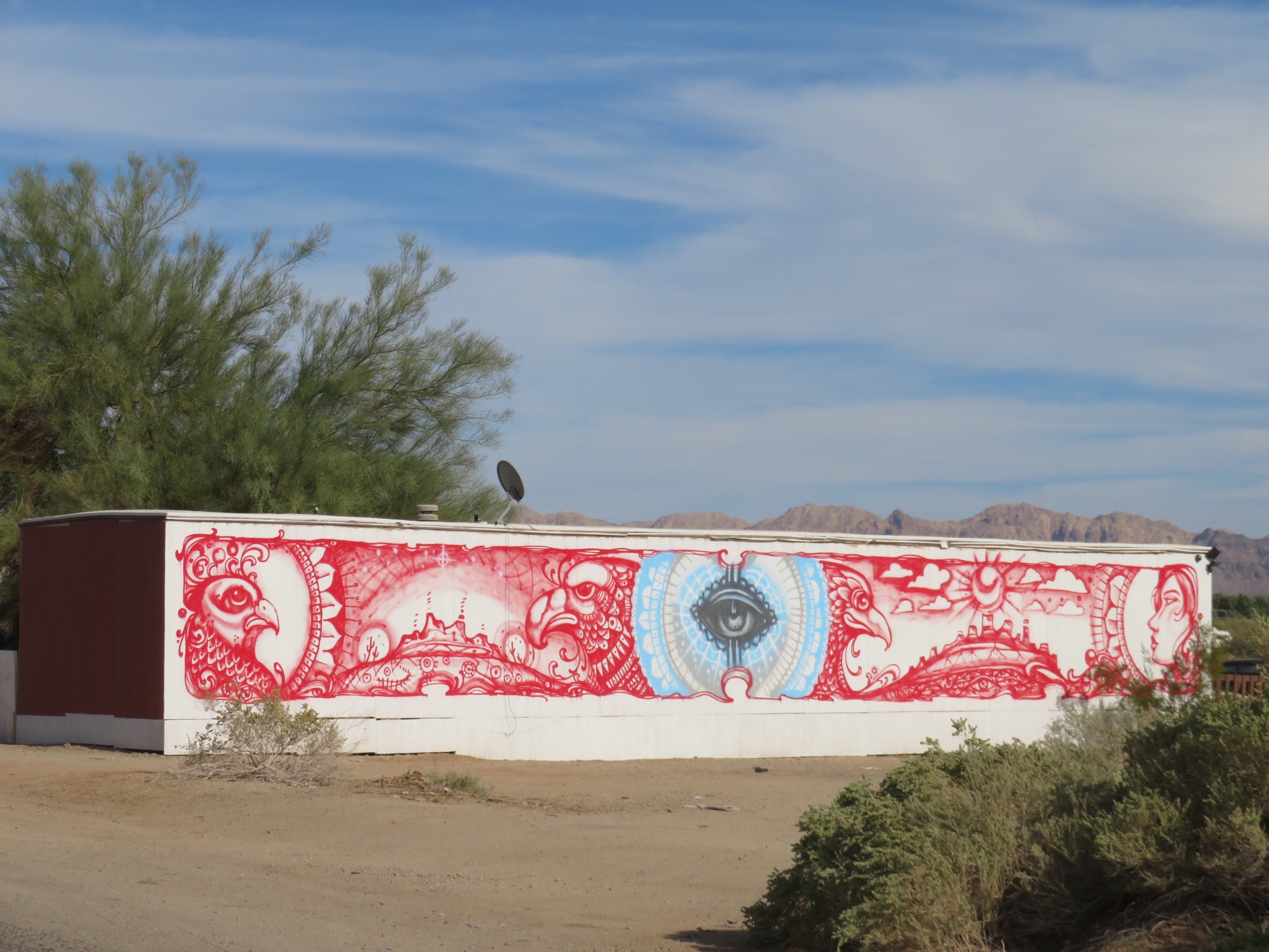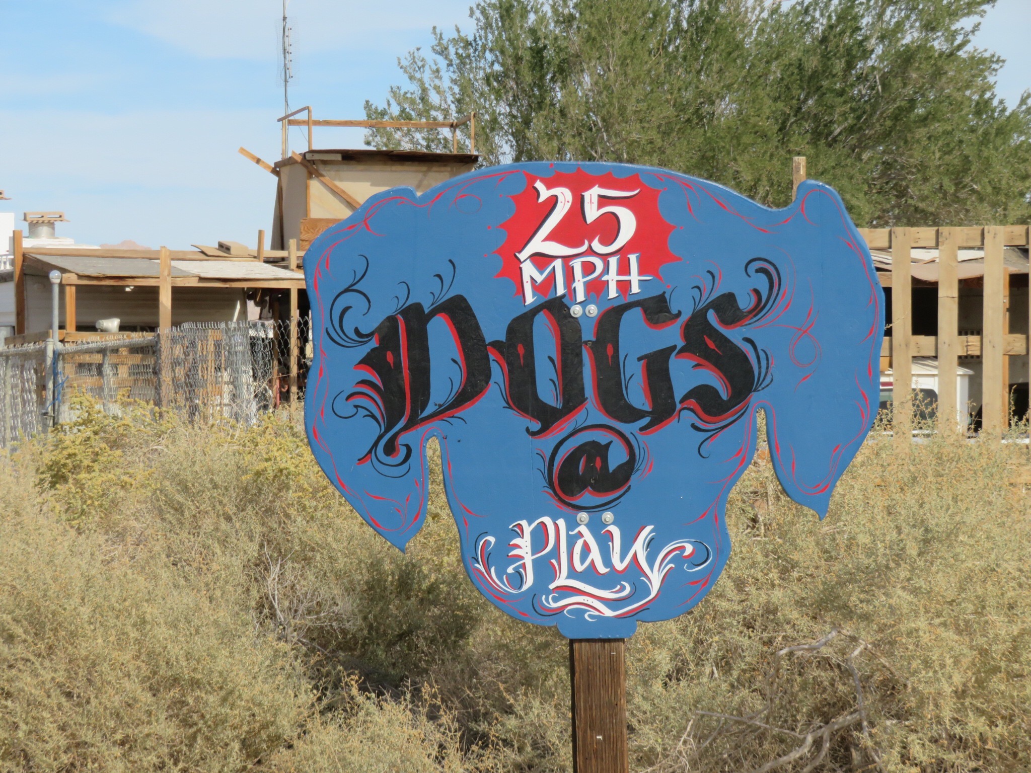 Once more, I was up with the sun walking the pooches around the neighborhood. When we got back, I tried to get a little more shut eye but I was excited about today’s visit to Slab City. We slowly got our camp disassembled, I guess a little too slowly as we soon found ourselves running late. ‘How does this always happen’ I was asking myself as we were racing a freight train running parallel along the side of highway 111 heading towards Niland. The train passed us and the front of the train beat us to Niland. Even though we had to turn left down a side street for a ways before reaching the tracks, we still had to wait for the rear of the locomotive to pass. That’s how long they stretch out the trains here in the desert.
