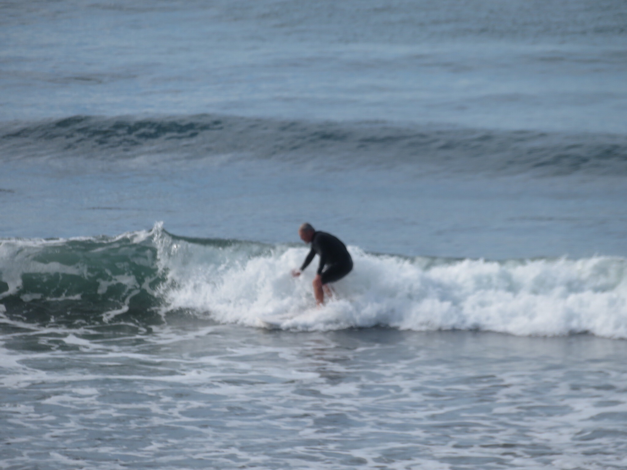 Before heading off to the store though, we decided to test the waters out front. I pulled out the Walden surfboard and waxed it up. It had picked up a decent sized ding somewhere along the road. I plugged it with some wax and paddled out anyway. The tide was low and the reef was shallow. Good for me the waves were a bit on the small side as I haven’t surfed since Lo de Marcos. I fumbled my way to my feet on a few but it wasn’t pretty. PJ grabbed her boogie board and came down and rode some white water into the sand. We didn’t last overly long since we only have spring suits plus I’m needing to get back in some kind of shape. About 50 minutes of floundering under sunny skies with light winds, actually a really nice day for winter.