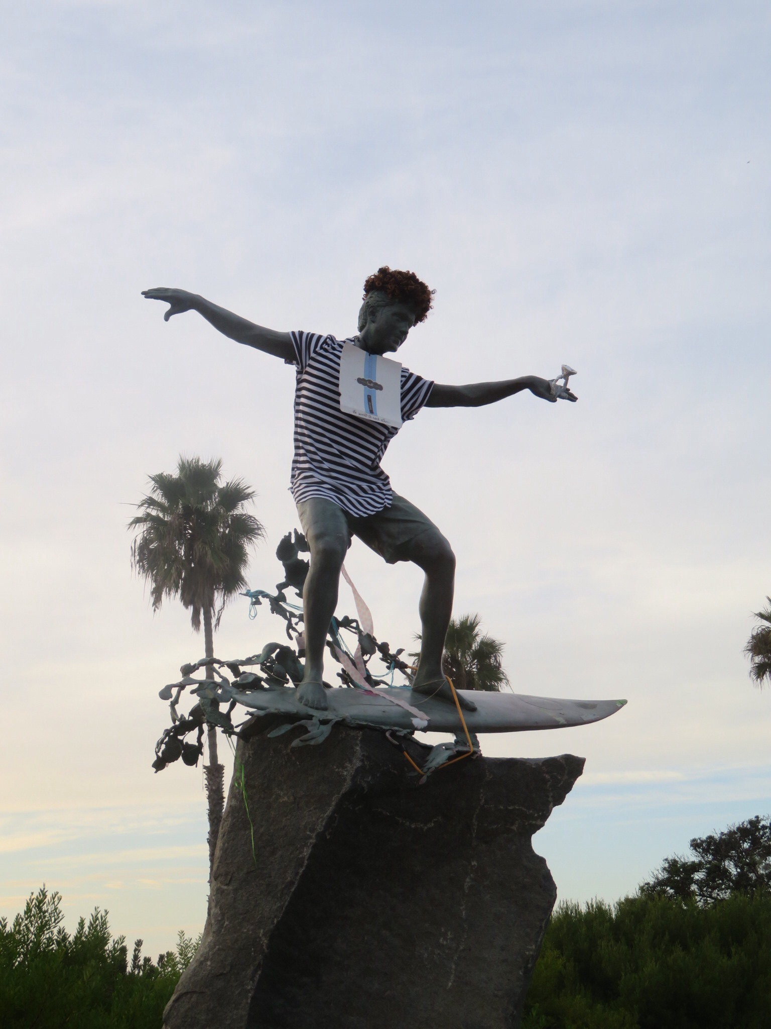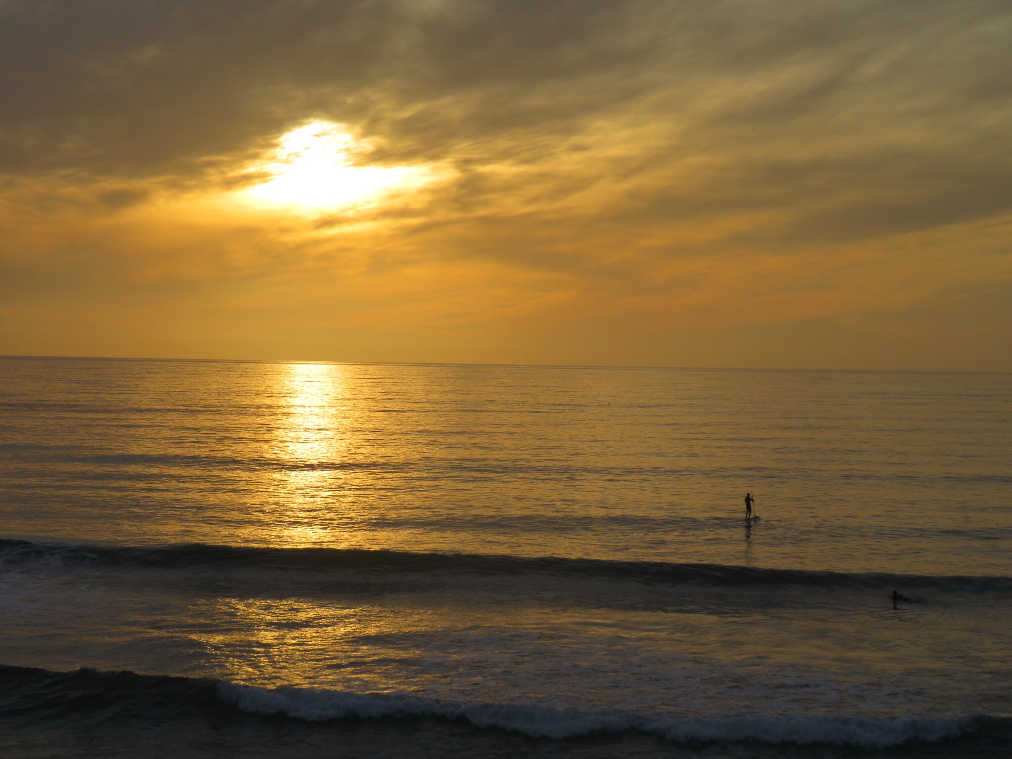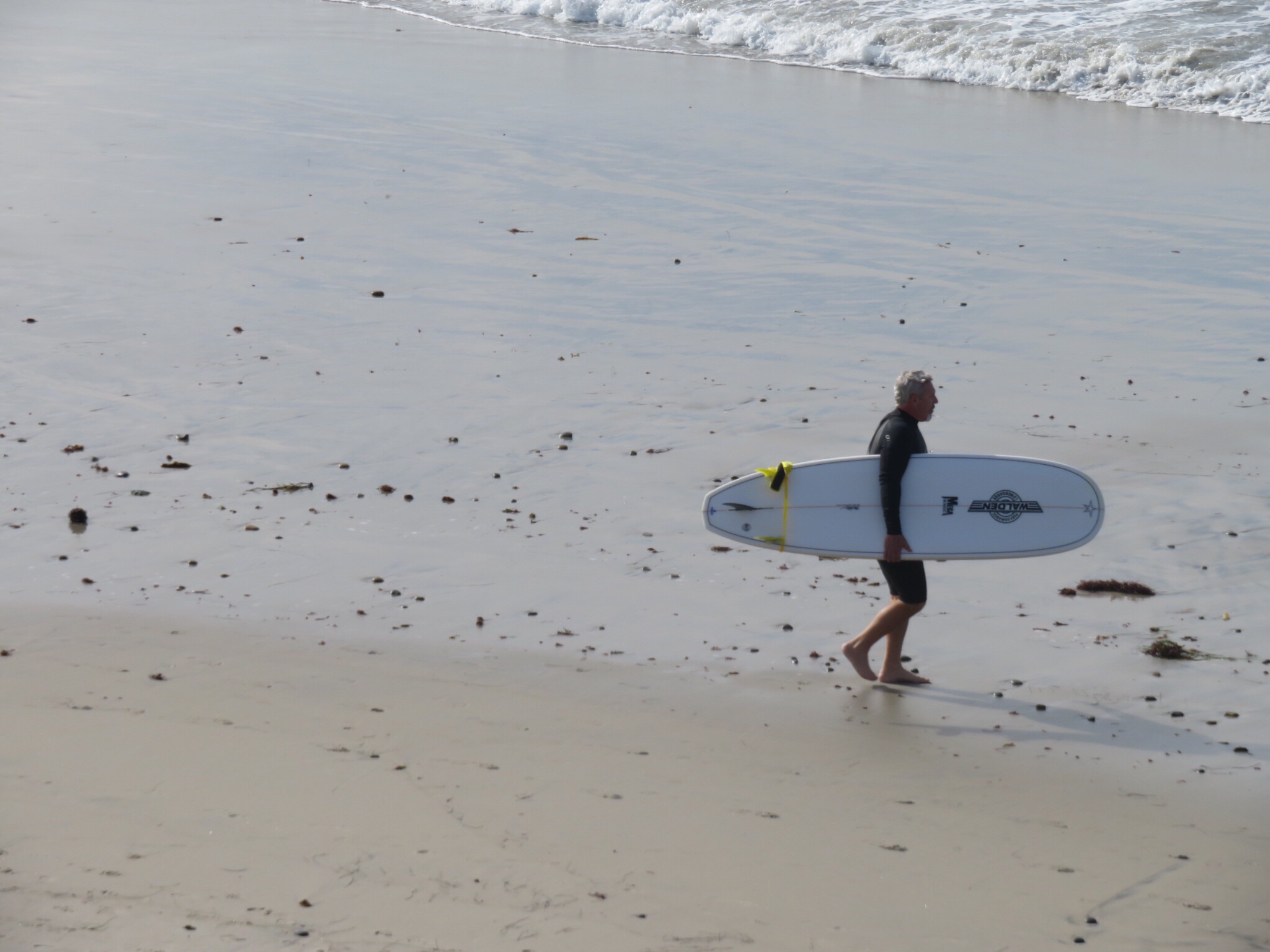 I woke up just before 6:30 and toured the dogs around the campground. After taking care of business, I put them back into the RV then walked down the beach to the south. Lots of early risers already surfing out at Cardiff Reef and every little break in between.