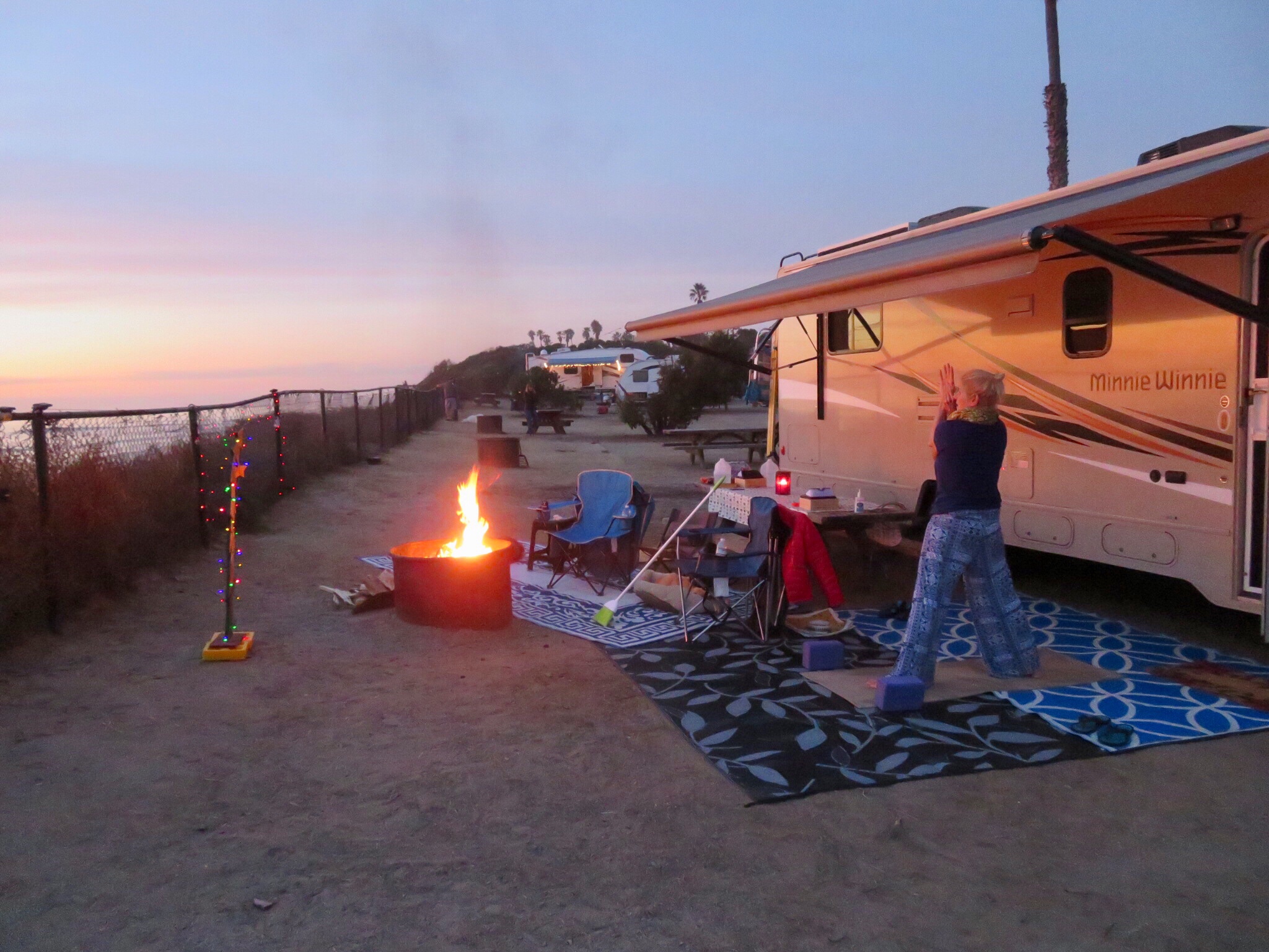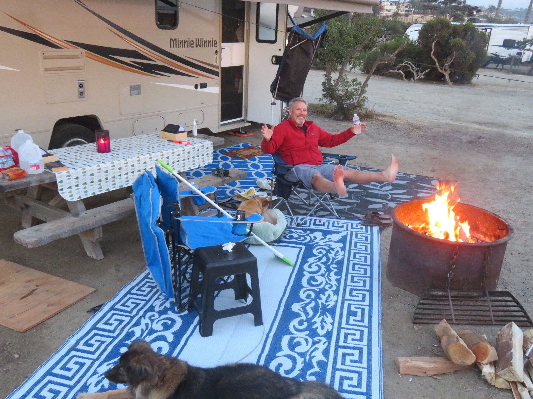 As the sun went down behind the clouds, we lit a fire in the pit and watched the sky light up. When darkness began to settle in all of PJ’s solar Christmas lights began to light up strand by strand. We got comfortable in our camp chairs and warmed our bones next to the crackling flames. I brought out the guitar and strummed a few tunes until the chill drove us inside where we watched a few episodes of Survivor before climbing under our warm Mexican blankets. Our solar set up is working excellent. We ran the inverter for three hours of t.v., used all our lights and pumps while charging all of our Apple devices. When we called it a night at 11:30, the batteries still had over 70% charge from today’s input from the solar panels. The dogs are out like lights and it’s time for sleep.