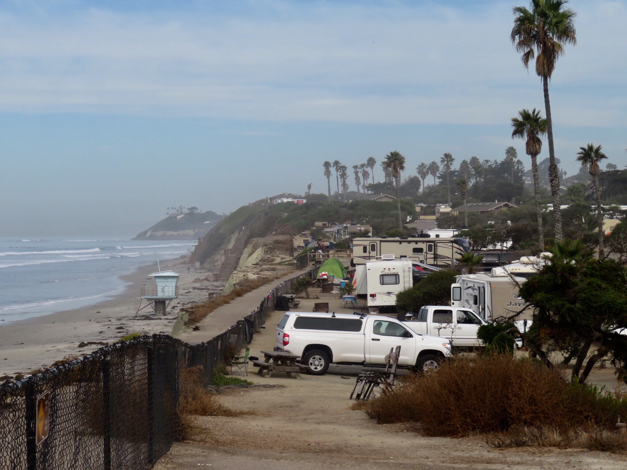 Today we had to move down a few spaces and check into site# 25, not nearly as nice as the campsite we have been at most of the week. We have a hedge along the fence at the bluff that blocks our view of the ocean unless we go stand at the chain link barrier to look over the top. Besides that, we are a few spots down and across from the trash and restrooms. Still not a bad place to be hanging out. Being Friday, tons of people are pouring in and every space is getting filled in. So much for the peaceful days of ~ 35% occupancy.