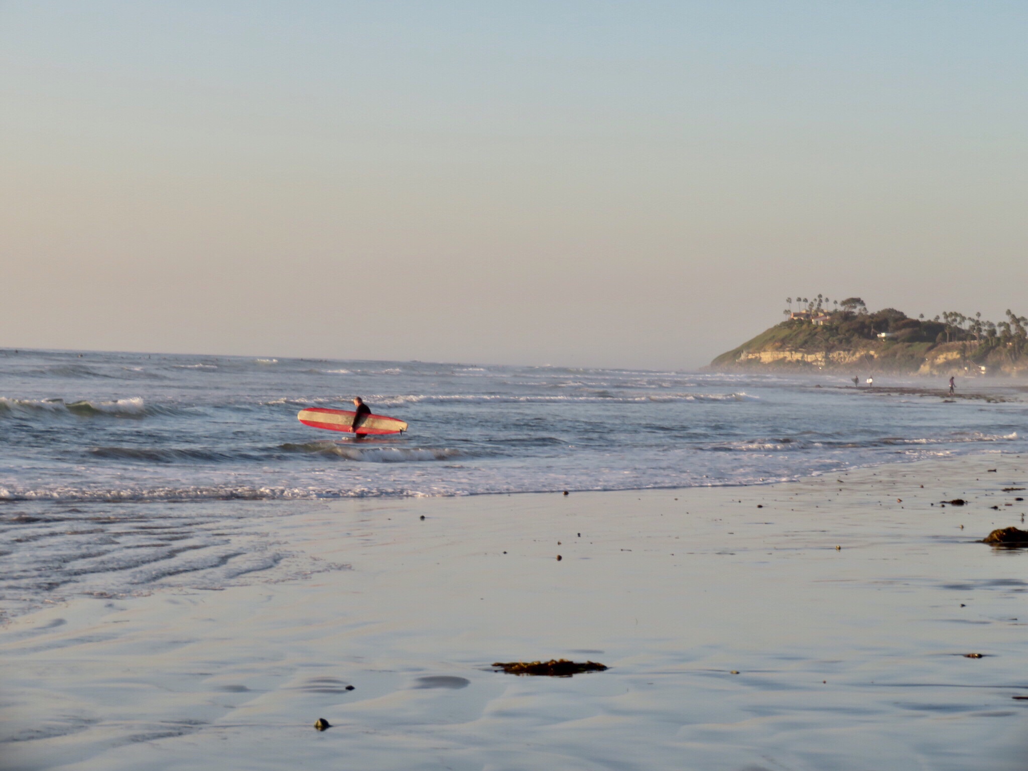 We broke down camp and PJ carried the mats down while I went to the dump station to freshen up the facilities. We got resettled then Pamela had to head over for a dermatology appointment in Carlsbad. I hung around with the dogs a bit then at around noon I paddled out for a crappy session in the blown out waves. Glad there was no one around to see me.