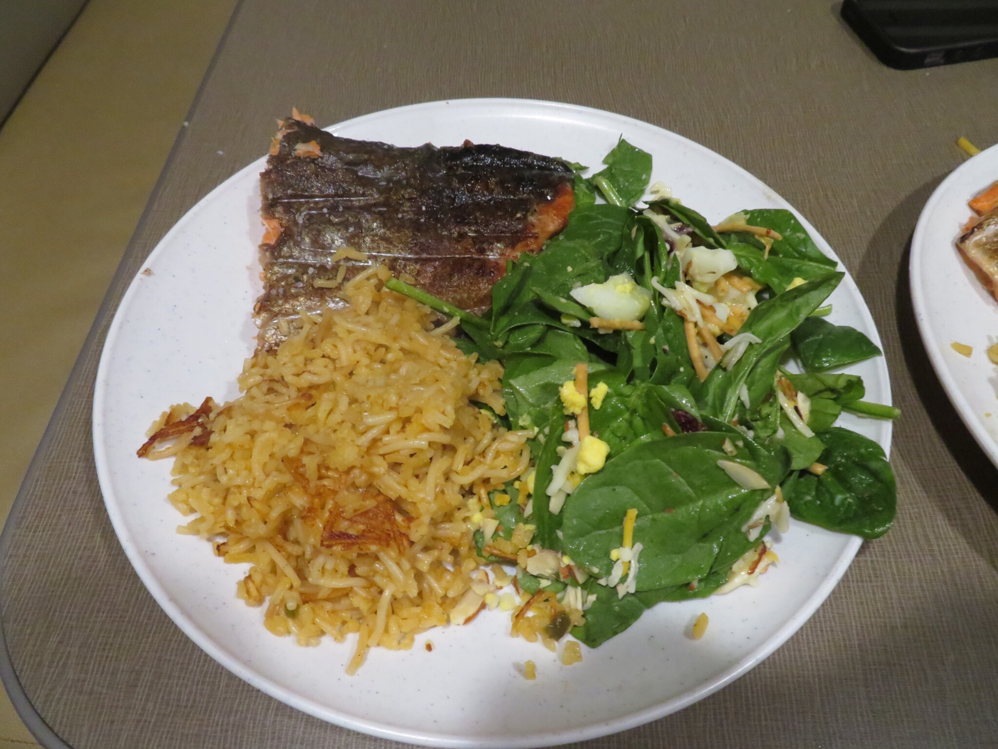 After rinsing off, we got a fire burning in the pit and I prepared a salmon filet on a hickory plank that we grilled on the open fire. New arrivals pulled in on our left and right. Young men in tents here for some serious surf. Hope it doesn’t get too loud. The salmon came out awesome, hickory flavored with a light sprinkle of Indian spices. Served it up with rice vermicelli and a spinach salad. We sat outside for quite a while burning wood and watching more tourists piling into the campground.