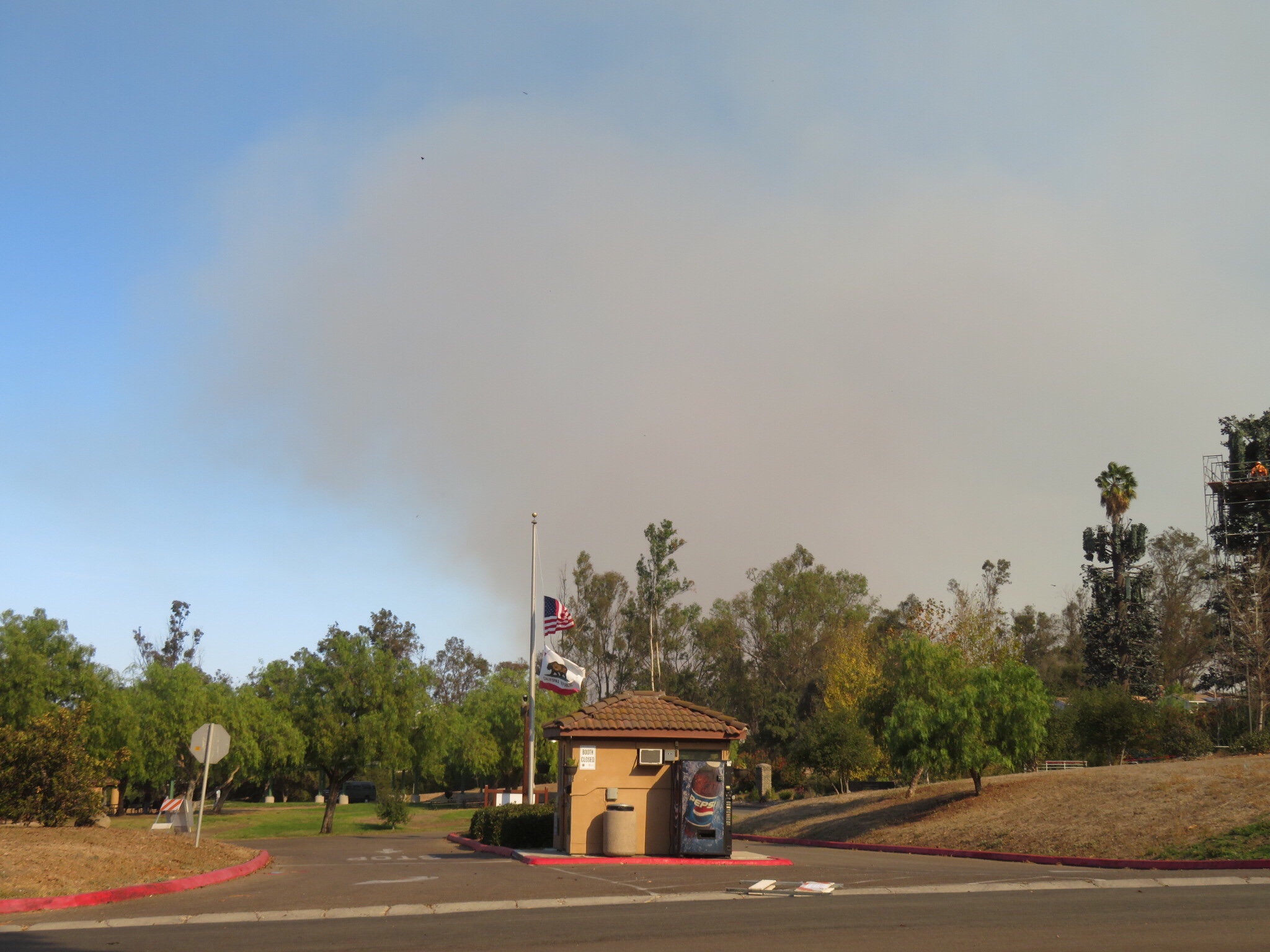 PJ and I kept an eye on it for a while and it became apparent that it was growing quickly and headed our way. We walked over to the ranger headquarters and they said it was over by Highway 15 and moving in our direction. The wind was blowing hard and we were soon enveloped in smoke. PJ started packing things up and I called Carlsbad State Beach to see if they had space. Pam got on the phone with them and we found a campsite for Friday and Saturday. They said that they were unable to reserve spots for the same day on the phone. We would have to go to the campground itself and check at the gate.