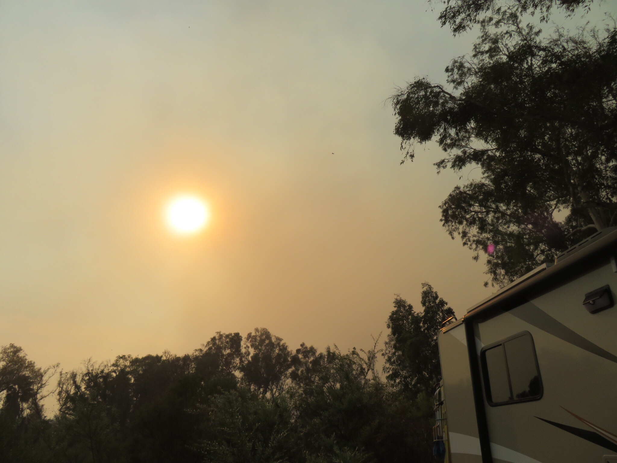 I was kind of slow moving this morning with a little tweak in my lower back. It was threatening to lock up so I laid back down and rested it a while. Our holding tanks were full so I tucked in the slide out, unhooked hoses and cords then drove over to the dump station at around 11:30. Looking to the east, I could see smoke filling the sky over the ranger’s kiosk.