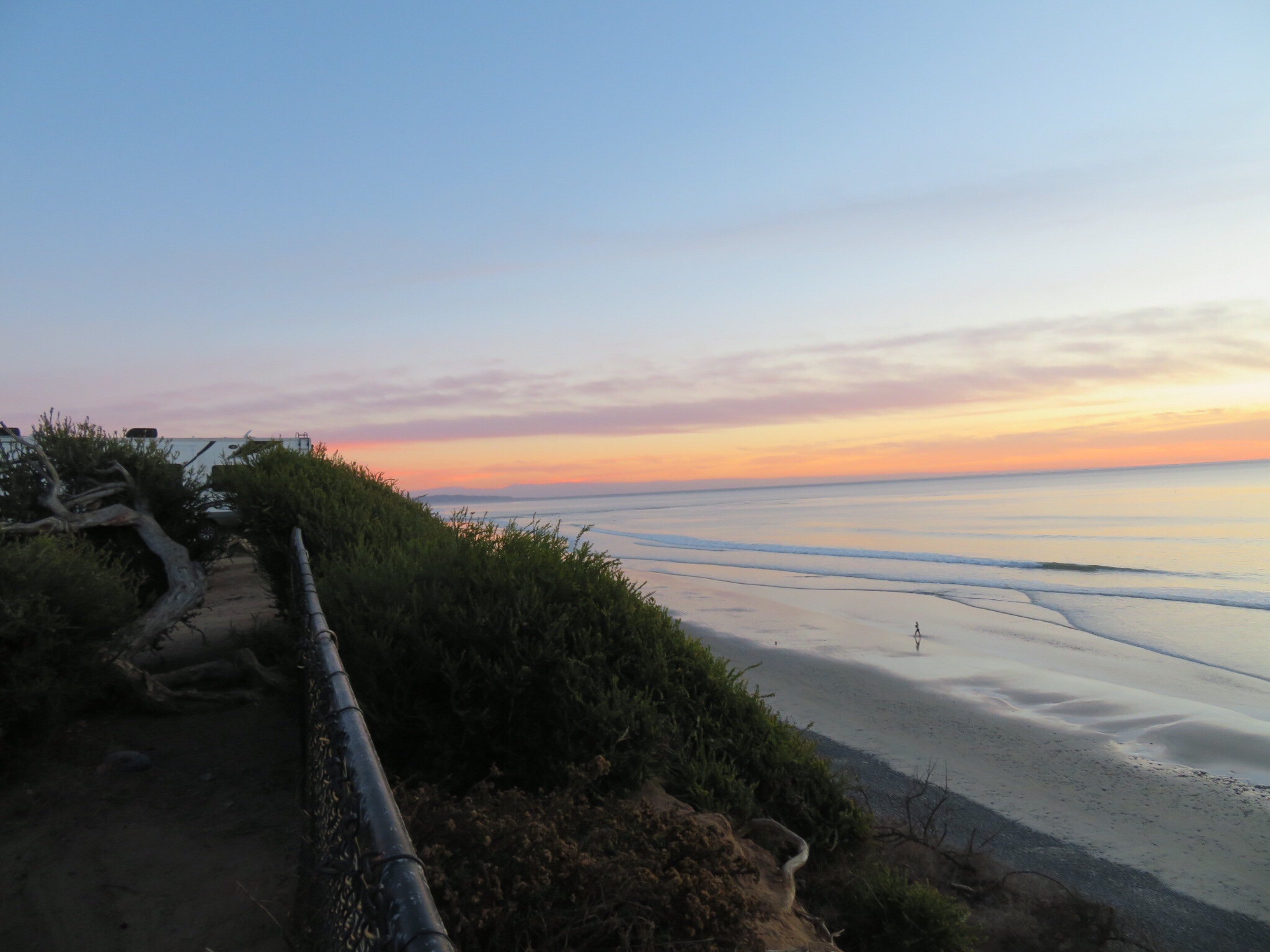 PJ took the Honda and went ahead to Carlsbad while I broke down camp and stowed our gear. Some of the other campers were pulling out and others decided to wait and see before making the move. Breathing was irritated by the smoke and the sun was obscured by the darkness, so we knew we didn’t want to stick around. I left Guajome at 2:00. By the time I reached the intersection of Cannon Road and I-5, PJ called and said that we had a spot on the ocean so I continued on and we set up on the bluff overlooking the sea.