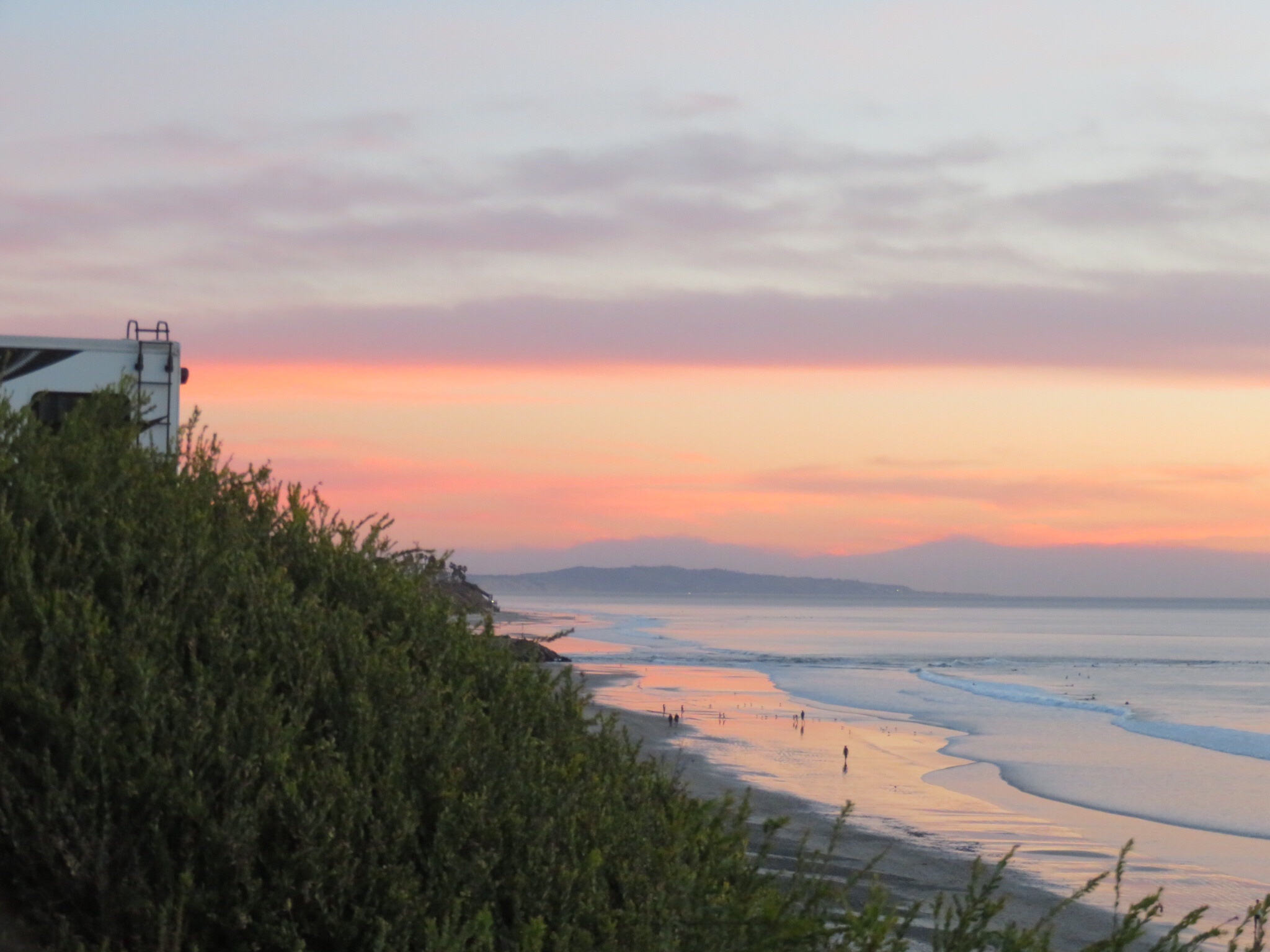 It was so nice to be at the beach and away from danger. The ocean was smooth and glassy with the offshore winds. The smoke could be seen blowing out to sea over in Oceanside. Lots of surfers were out riding the waves and taking advantage of the conditions. We turned on the news to see what was up with the fire and by that time it had covered over two thousand acres. The sunset was enhanced by the smoky skies.