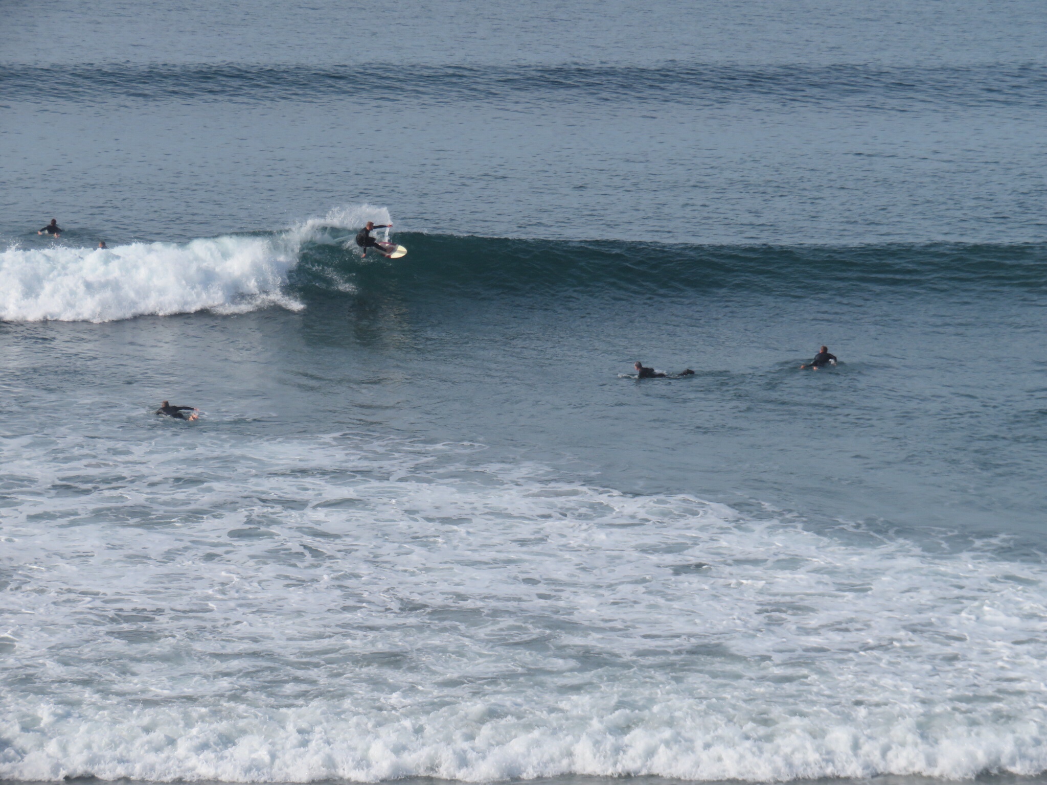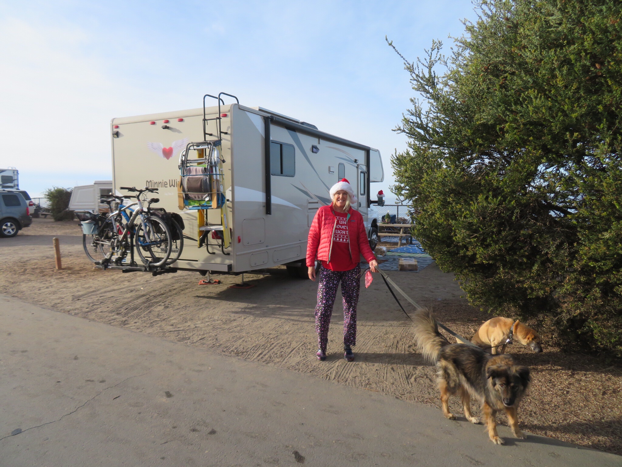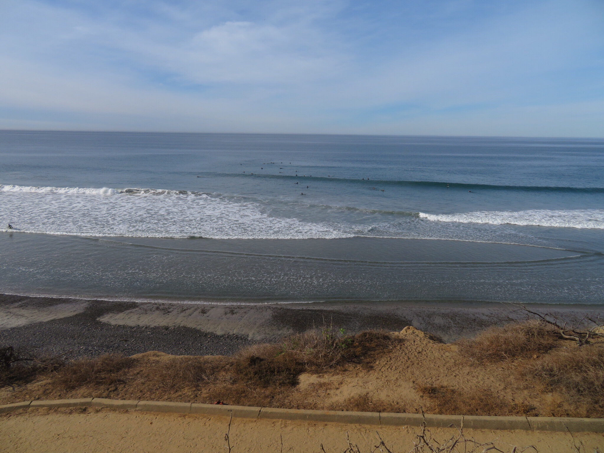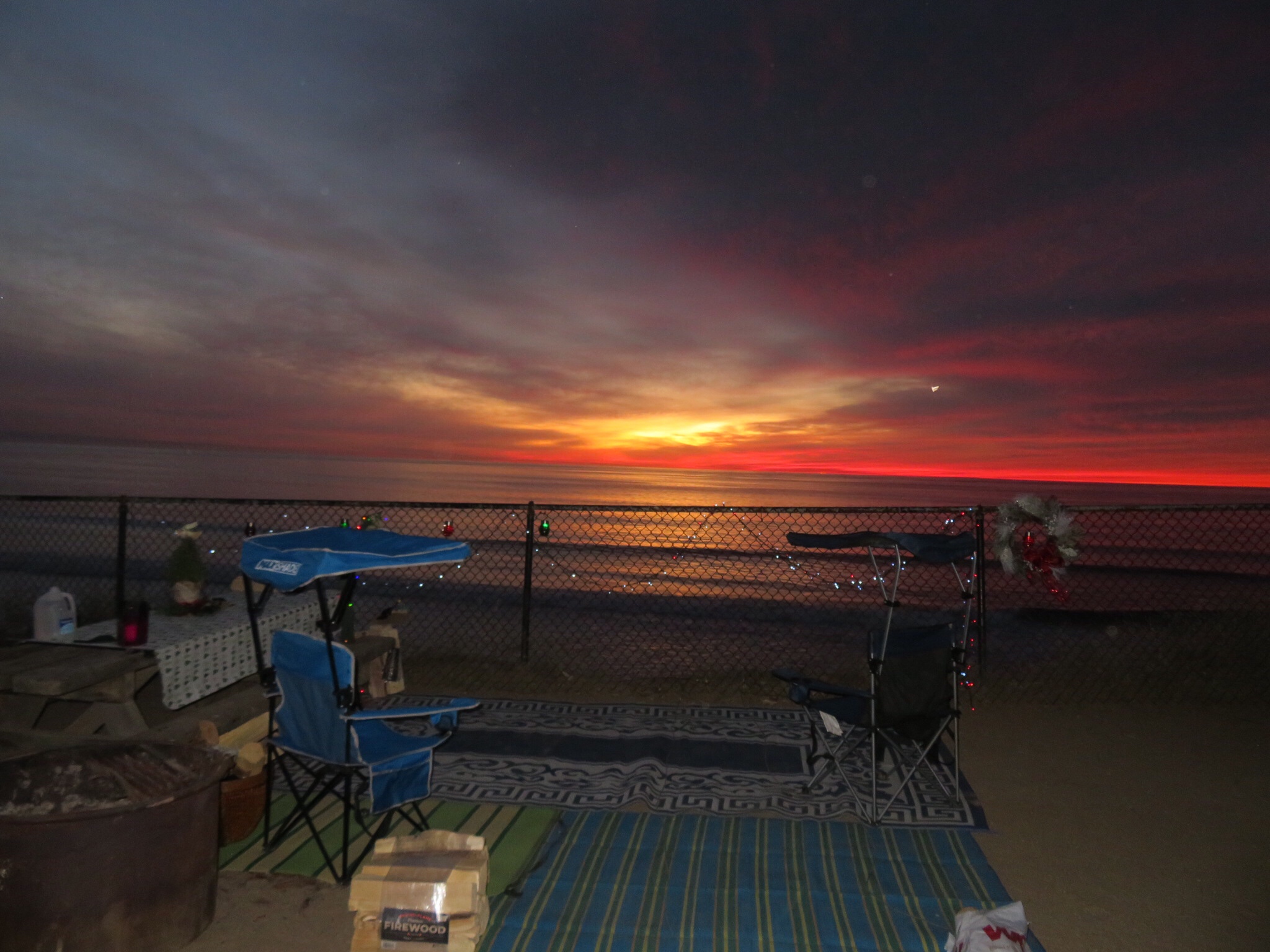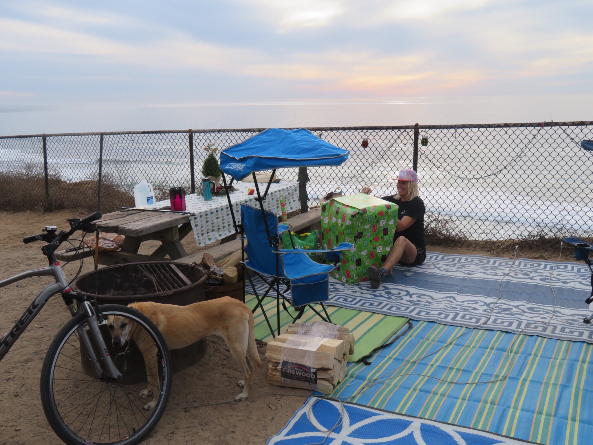 Anyway, I took Wilson over to the dump station and cleaned house topping up the fresh water tank. Without conserving, we can go 4 days between dumping and refilling the fresh water. If we are out in the wild, we could easily take more care and stretch that by a day or three. While I was dumping, PJ carried the mats and chairs and set them up at our new digs. Even better view of the surf from this site.