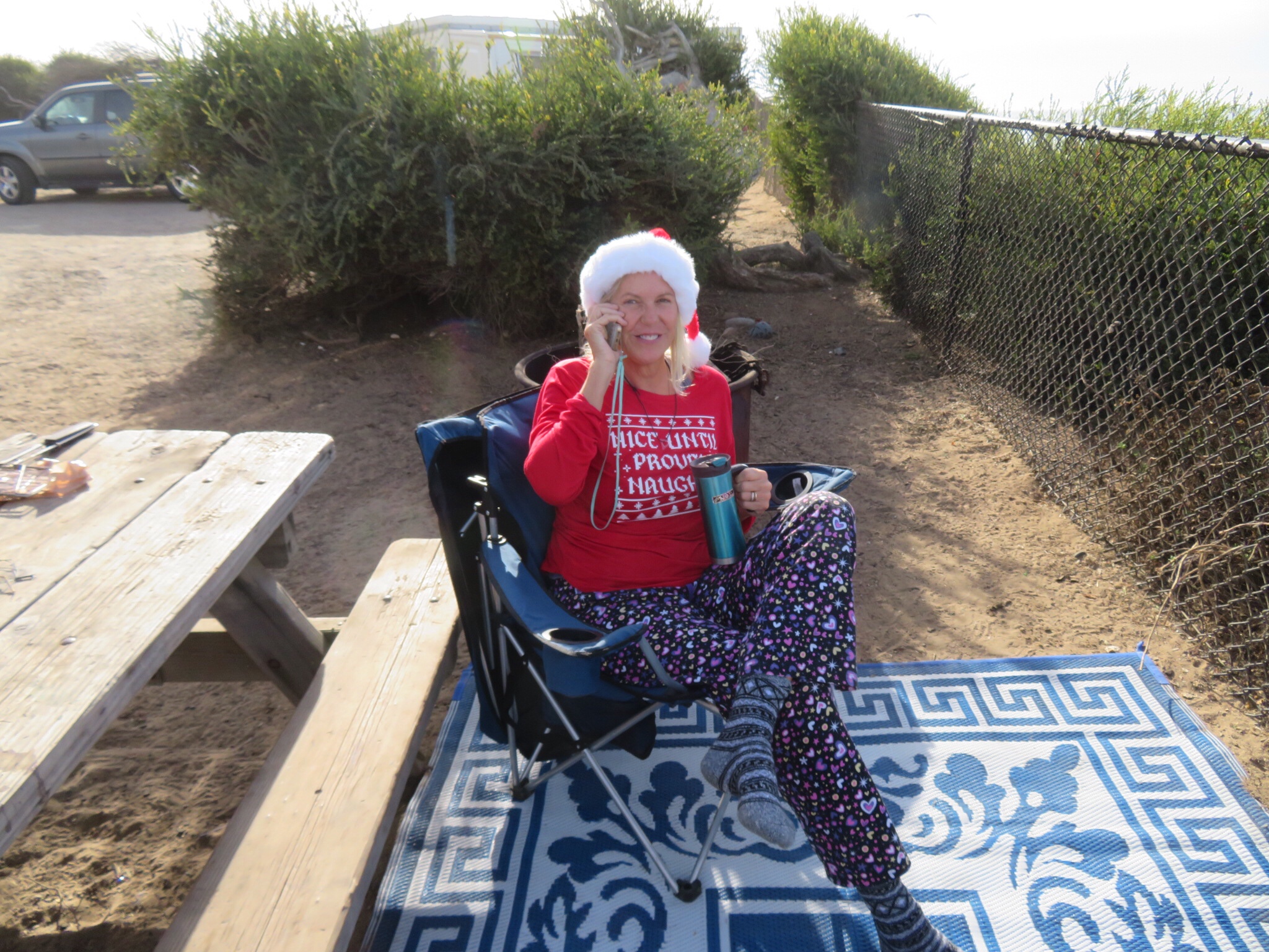 Anyway, I took Wilson over to the dump station and cleaned house topping up the fresh water tank. Without conserving, we can go 4 days between dumping and refilling the fresh water. If we are out in the wild, we could easily take more care and stretch that by a day or three. While I was dumping, PJ carried the mats and chairs and set them up at our new digs. Even better view of the surf from this site.