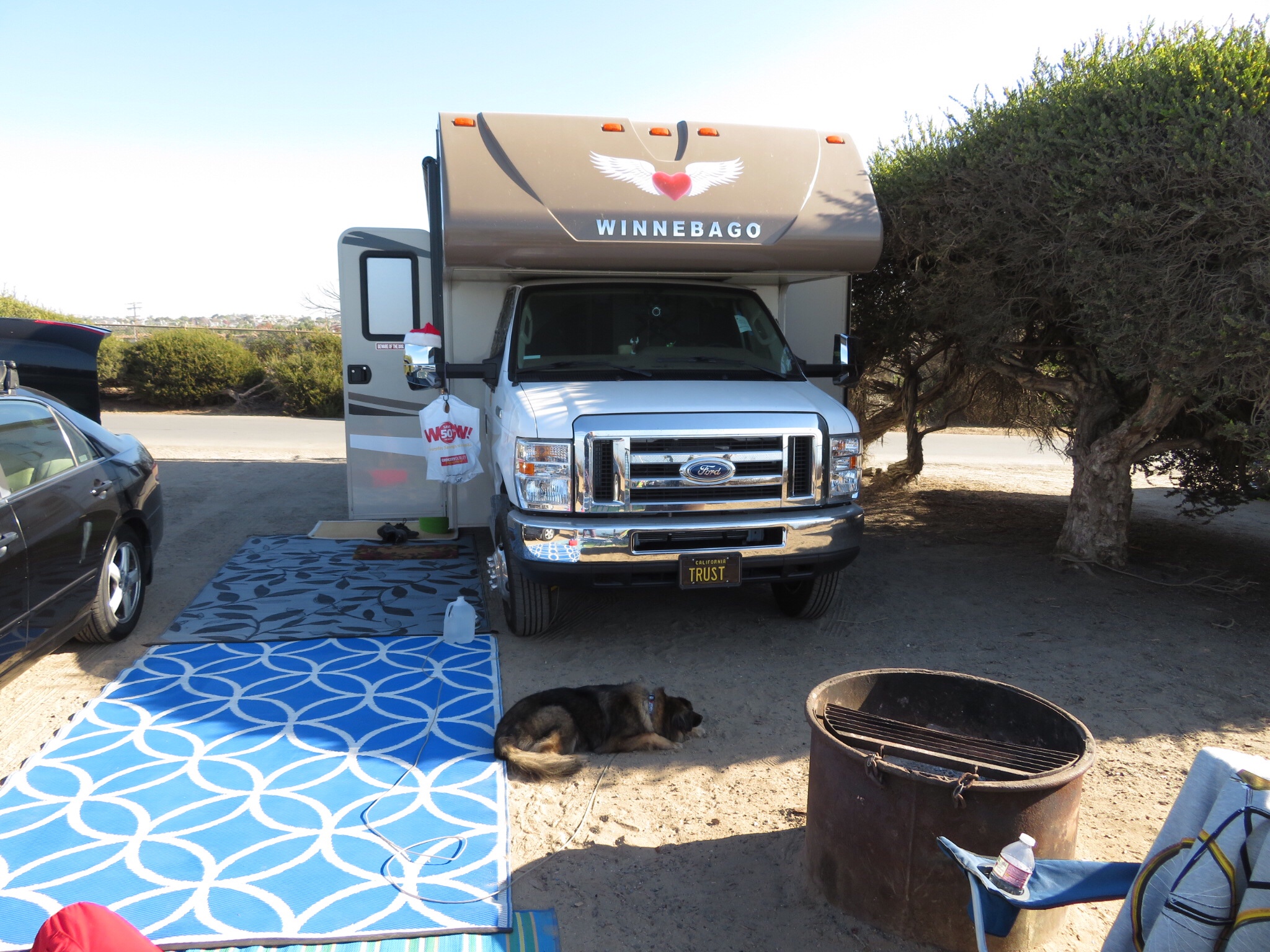 Doheney State Park is our next stop after a low key end to our week. Wednesday, I took a sick day and pretty much lounged around camp all day doing very little but an occasional foray with the canines. The highlight of the day was a visit from my good friend Dave. We sat on the bluff watching the surf and talking about everything under the sun. He stayed long enough to smoke a fat cigar that looked oddly similar to a robust dog turd nicely tapered at both ends. He headed off to take care of business and we’ll figure out a plan to get together next week. PJ visited the girls at her old home group that evening over in Leucadia.