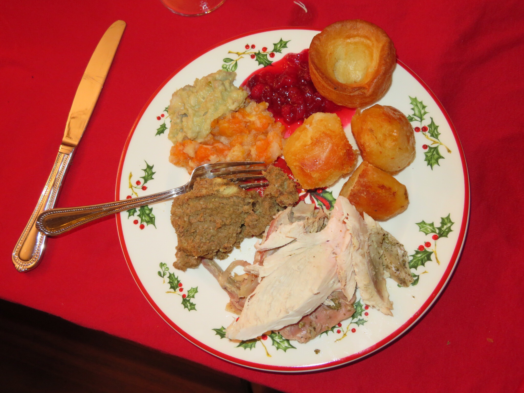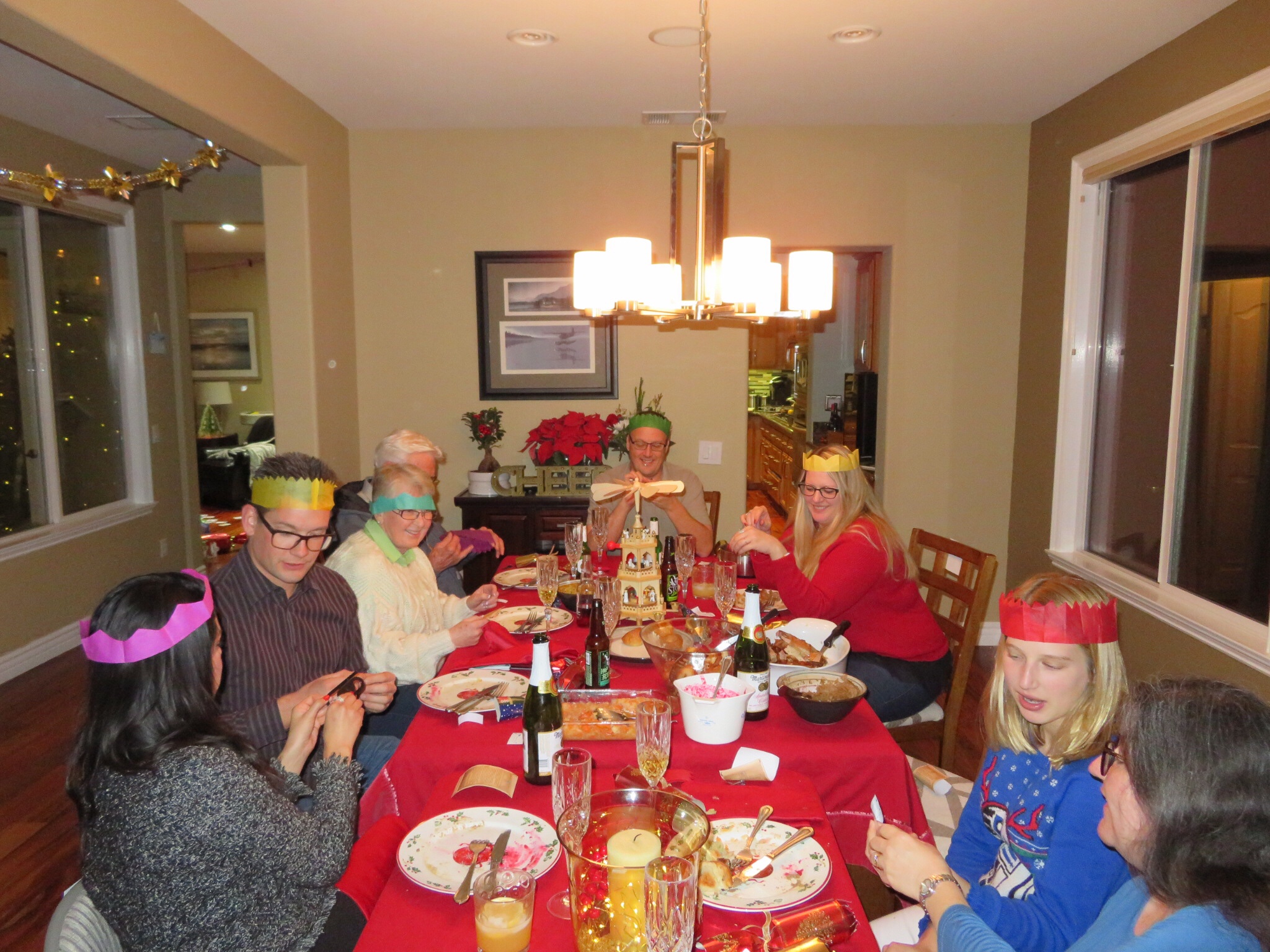 Soon dinner was served and we all gathered around the big table and had a festive dinner. Excellent fare and interesting conversation. After eating we opened the traditional English poppers that you pull the ends to make them snap then a little toy or trinket falls out. Inside is your paper crown so we all tiara’d up and had some laughs.