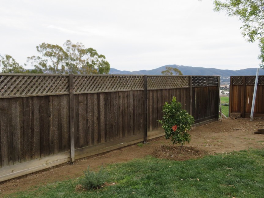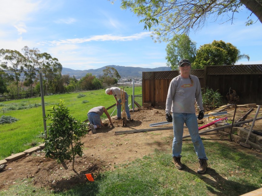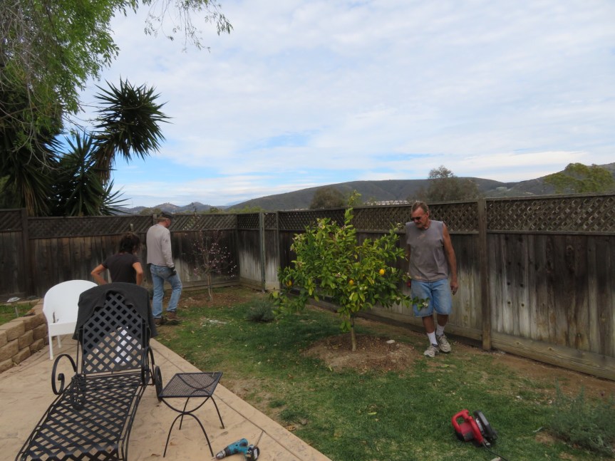By lunchtime, all of the metal posts were in and we took a mid day break to allow the concrete to set up a bit. Sandy and Karen ran errands and had an enjoyable day roaming around north county. In the afternoon, Don and Bill reinstalled the panels with help from Dad and Don’s wife Rosa. The yard was fenced in in short order and things are looking pretty good. My hip was beginning to ache so I begged off any further physical labor and took off to do some shopping. There are a few small finishing touches to be done, but Dad seems pleased with the fencing.