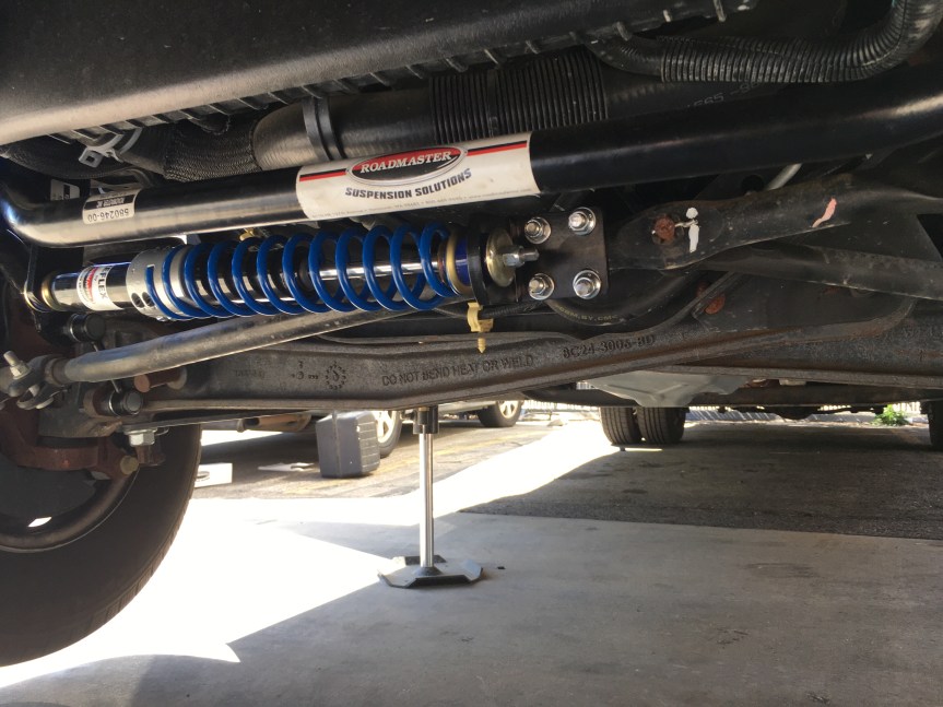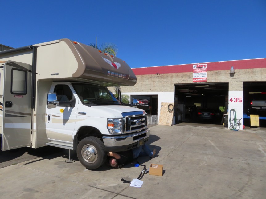 Been keeping busy getting things in order for a tentative Monday departure. Yesterday I took Wilson over to Big Red’s Automotive and Ken hooked me up getting the front sway bar installed and setting up the steering stabilizer to keep the RV from moving around so much in the wind. This was a job he normally wouldn’t do because the motorhome doesn’t fit in his shop and he can’t get it up on a lift. So I really appreciate them going the extra mile to get it taken care of.