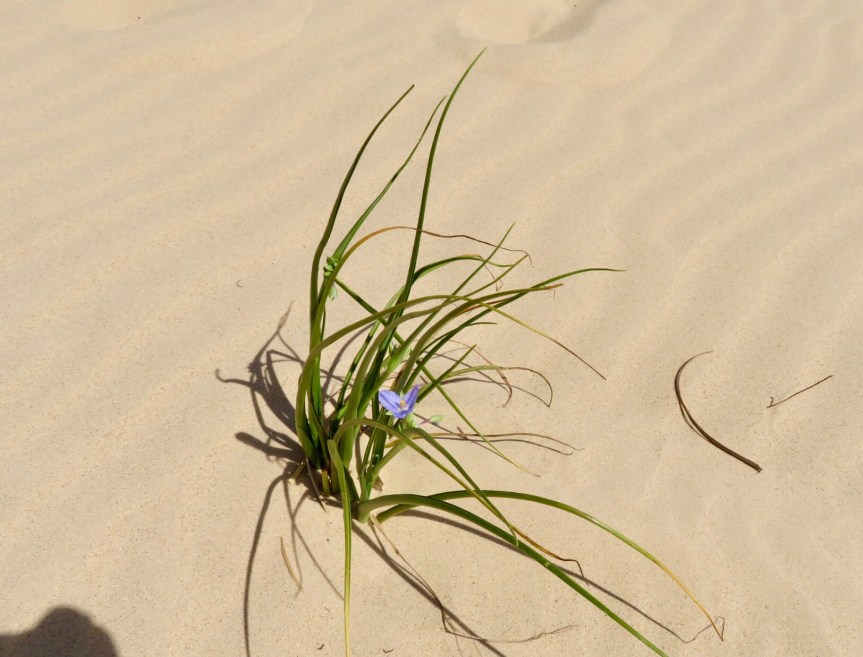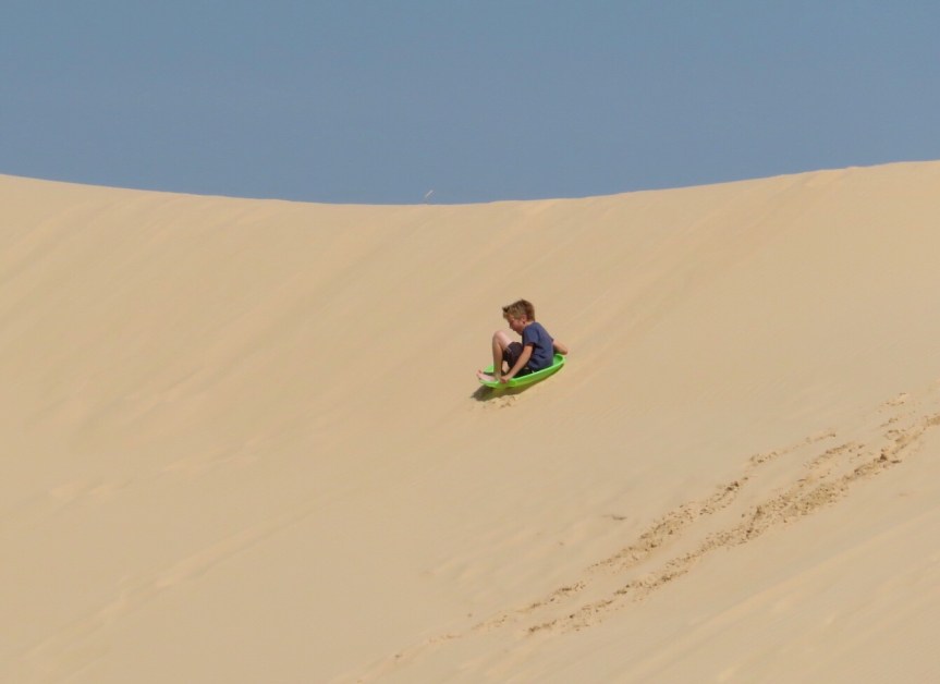 It was a lazy morning, laying around reading, doing sudoku and crosswords. Never quite napped but was fairly comatose much of the time. Outside it was overcast and cold so hanging out drinking hot tea was easy to do. Later in the day, it warmed up quite nicely and being Saturday, there was a ton of day visitors out to play in the dunes. Cali and I hiked up the nearer of the sand hills and sat on a little berm and watched the kids (and adults) slide down the steeper sections on little discs, something like plastic trash can lids. People were having a blast and the laughter carried far in the echoing hollows created by the dunes.