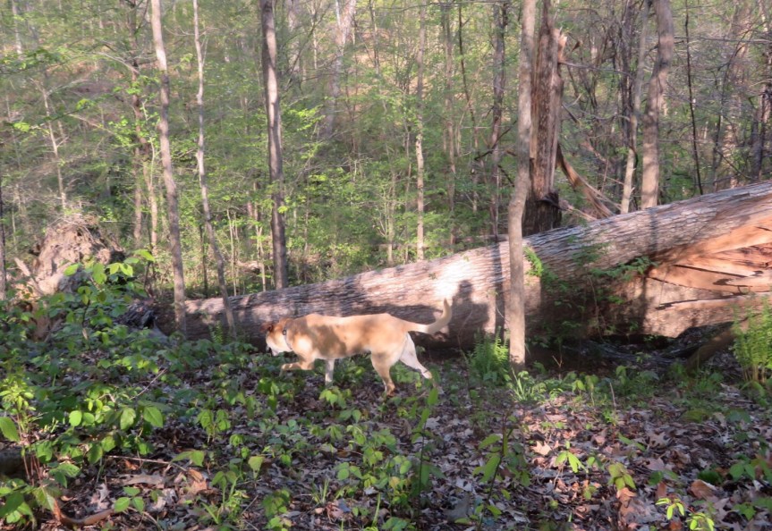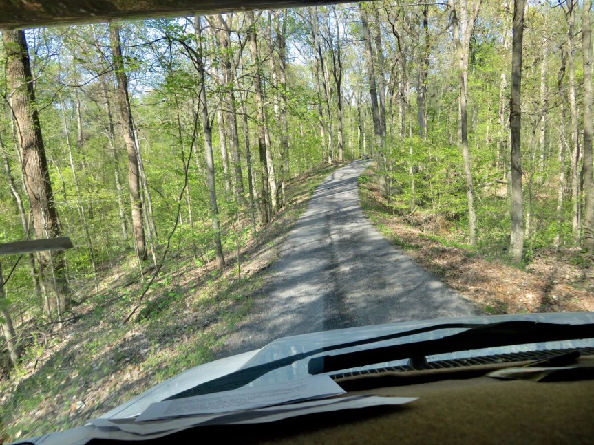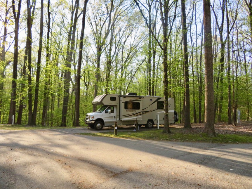 Ate some dinner and took a shower then we went for another tour of the campground in the darkness. Some of the empty areas were a little spooky with the heavy wind howling in the trees. Encountered our first fireflies of the trip. They were blinking among the trees as we made our way around the camp. Always get a kick out of fireflies. I get excited like a kid. Got back in the RV and Cali was having a panic attack. Gave her a pill and tried to calm her down. I sat at the table and petted her until she finally mellowed a little. The wind is sketchy. Laying in bed it is roaring through in gusts. Small bits of debris clatter on the roof from time to time. Hope no big branches fall. At this point, there is really no where else to head to. So, as the license plate says – “TRUST”. Tomorrow, they are calling for “severe” weather. Not sure what that means but I might hit an urban RV park near Nashville to sit that out.