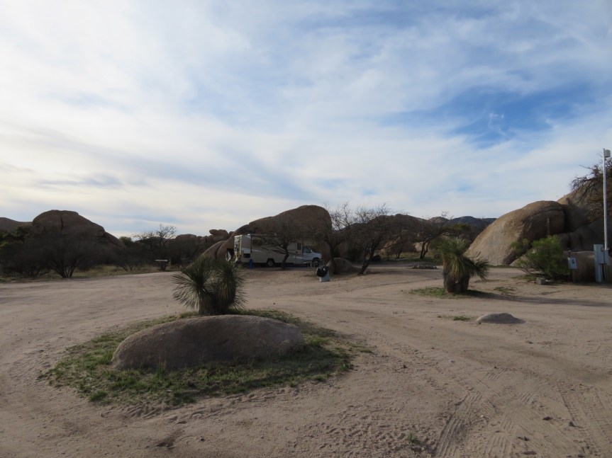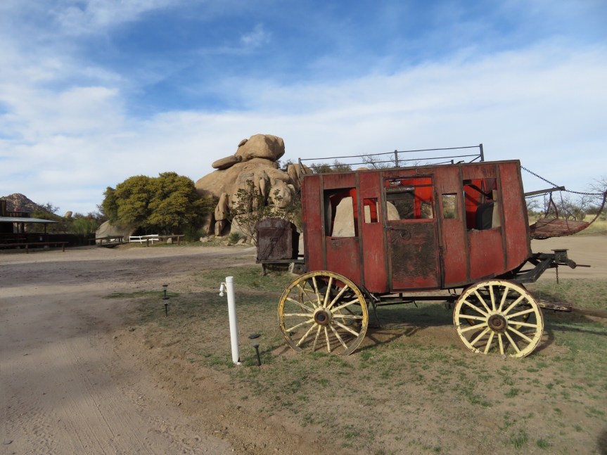 I had discovered the place while foraging around on the Internet yesterday and it looked a bit different than the average camping experience so I figured to give it a shot. I pulled in and it is a total ghost camp. There was a nice lady in the office who signed me in then sent me over to site #8 in the lee side of a giant boulder to help break the wind. I am the only one here. They have a dozen or so casitas that are their main bread and butter, but I didn’t detect signs of life in any of them either. There appears to be a few staff around but otherwise it’s a little spooky. This place was the spot that Cochise used to pass the winters back in the day. It was also the set for some old cowboy movies and in its glory days it hosted actors such as John Wayne, Glen Ford and Roy Rogers.