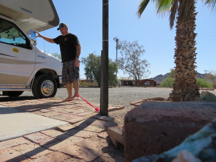 We pulled out at about eleven and backtracked to the date farm and put some overpriced gas in the RV. Well, overpriced for AZ, it was still almost a dollar a gallon less than I paid in California the day before. Long easy drive on a straight two lane highway. We pulled off into the brush a few times to walk the dog and make a pbj. Turned south onto interstate 10 towards Tucson at Casa Grande. Hit some traffic and unpleasant drivers going through Tucson but we were soon out the other side and closing in our destination for the night. I stopped at the Love’s gas station in Benson and filled the tank then drove the last few miles to the Triangle T guest ranch out in the boulders of southern AZ.