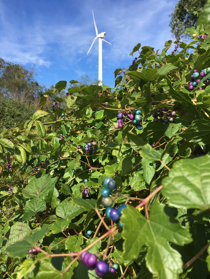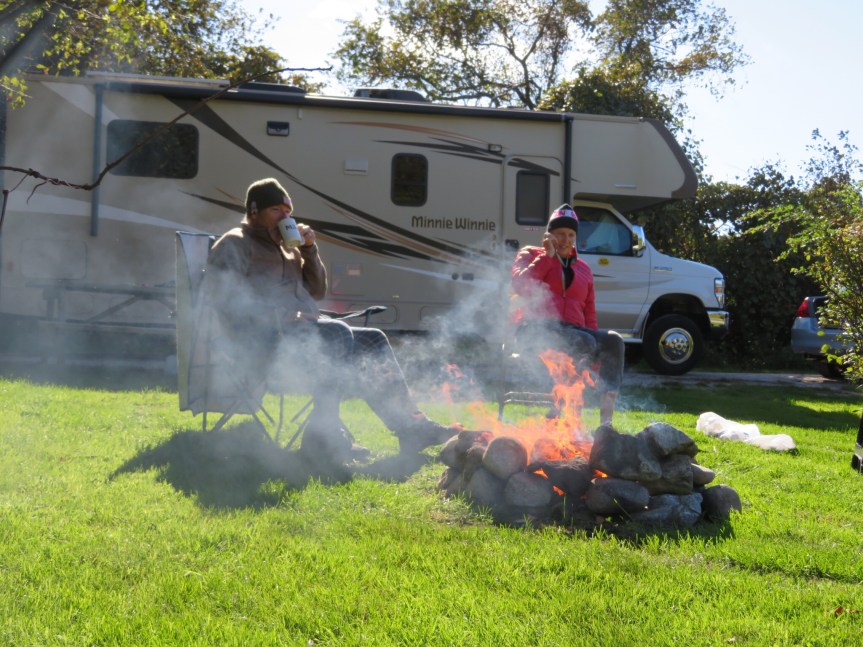 We had intentions of getting up early and joining a group of friends down at Narragansett town beach at 7:00 a.m. but somehow the alarm got cancelled and we slept in until the air outside warmed up a bit. Cali and I had completed our morning walk and I was sipping tea when PJ went outside to start up a fire in the pit and sit in the sunshine and make a series of phone calls. Soon a smoky, wind blown fire was blazing among the rocks and PJ made calls while I practiced a few chords on my guitar. Her calls lasted hours and I soon wearied of the wind and went inside to goof around with my flute and latest acquisition, a small harmonica that I can play with as we travel along.