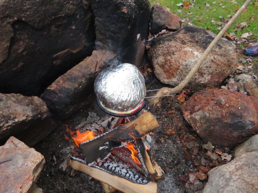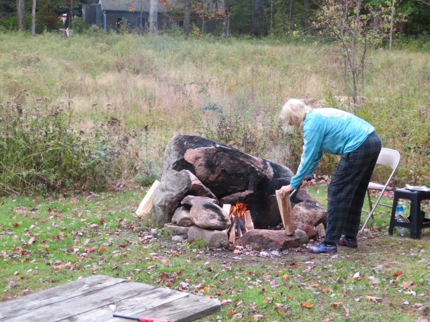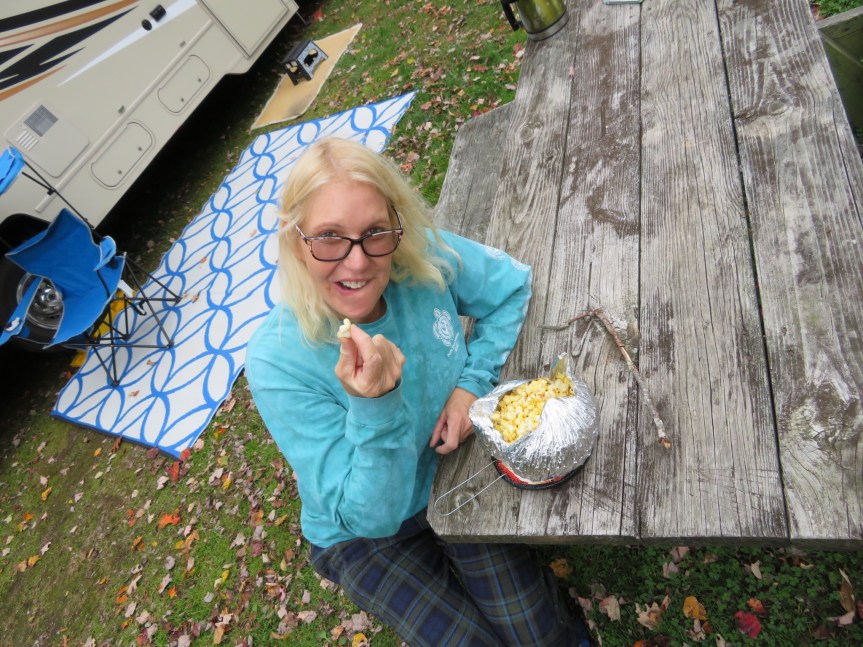 Back at camp, I set us up with some brunch and we ate out on the porch. It was much warmer today and we were able to do a lot outside. PJ got the notion to light up a fire in the pit and grabbed a load of wood out of the trunk. I strummed a few tunes while she put her Survivor fire making skills to the test. We soon had a nice blaze going and we moved our chairs over to the fire ring and enjoyed the smoky warmth. We’d been hauling around a Jiffy Pop popcorn tin for the past year or so. PJ dug it out of the kitchen cabinet and rigged it up with a stick and worked her magic over the campfire.