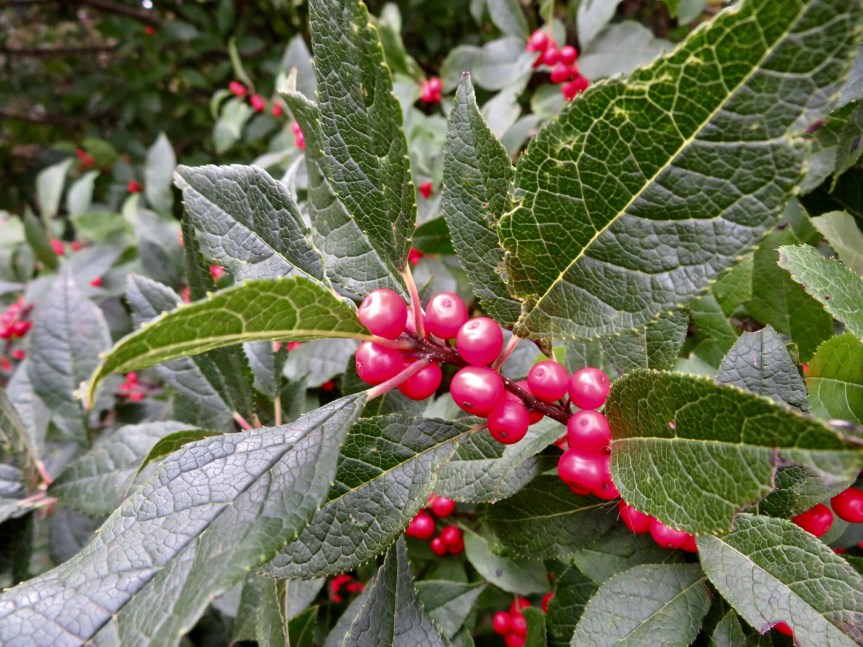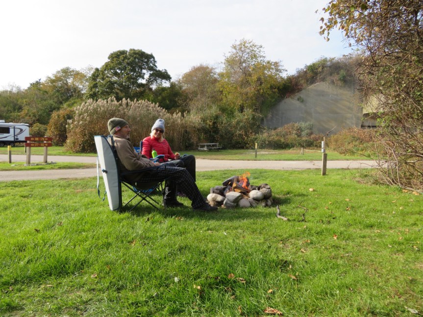 There is a little back road where they keep piles of gravel and mulch for the maintenance crew. It was apart from the main camping area so there wasn’t anybody else in the area. It was a good place to let Cali run off leash and she was enjoying the freedom. There were lots of quick little birds darting in and out of the woods. The trees were colorful and the sun was doing its best to warm up the atmosphere. The temp was reaching the low 50s by midday making for a pretty fall afternoon.