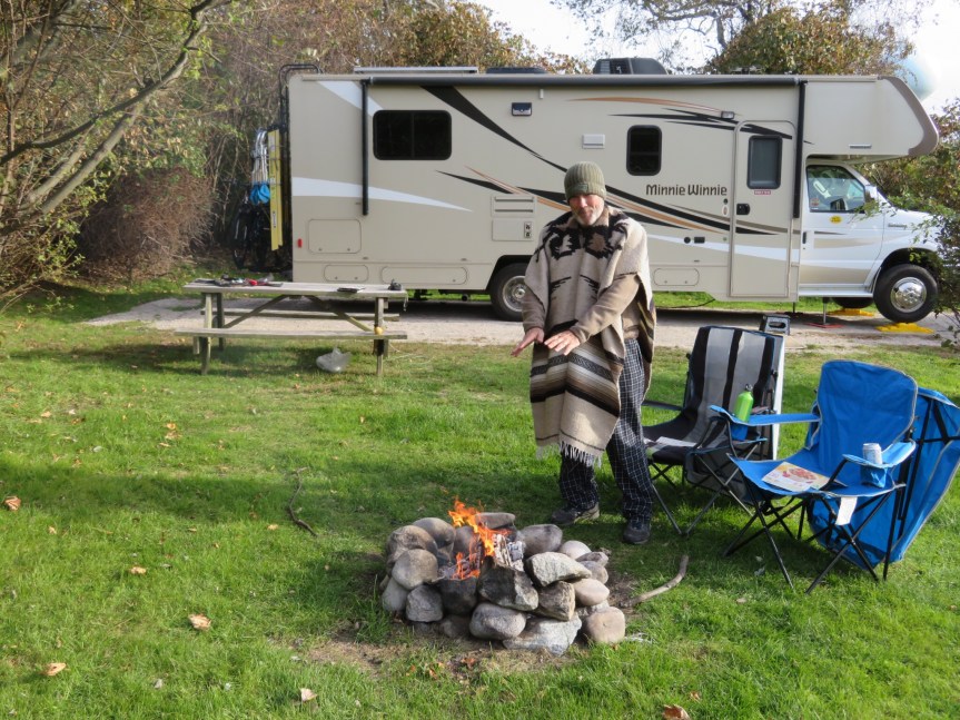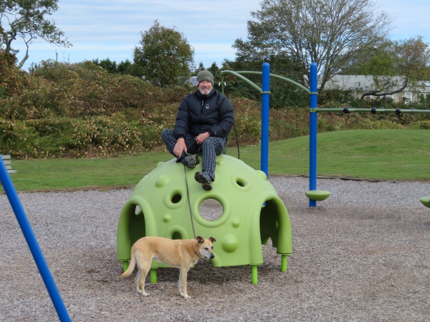 With the near freezing temperatures in the early morning these days, we tend to move a little slower as we ease into our day. After a late breakfast, we went out for another long walk meandering through different areas of the park. We explored the area around the playing fields. They have tennis courts, basketball courts, a playground and open fields to run around on. Not that we were doing any running around, but we did goof around on some of the playground equipment for a while.
