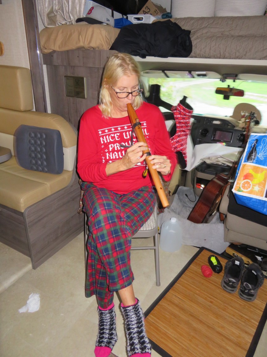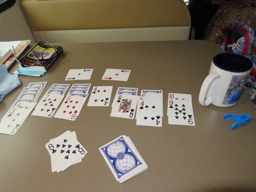 A few of the other campers fled but a large number of hearty survivalists dug in and are sticking it out along with us to weather the storm. We did a lot of reading, working on music and playing a few hands of cards. Cali enjoyed our full attention and rested peacefully in her bed. After dinner, it was time for more binge watching of Game of Thrones. We are now into season six. A nice distraction on a rainy night.