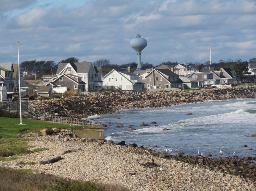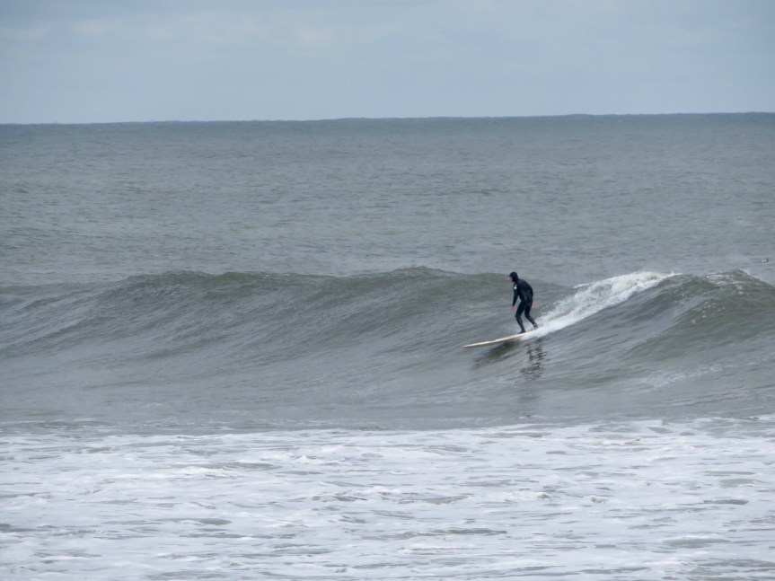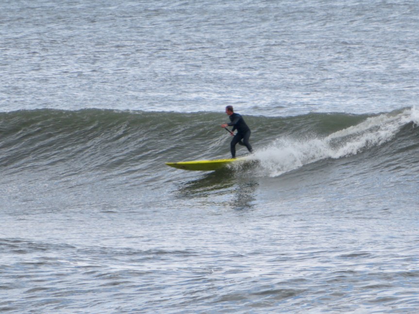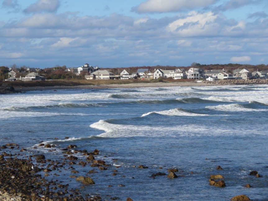 The view down the beach was picturesque with the rocky shoreline, shimmering waves and rows of typical New England style cottages lining the shore. Seabirds were plying the rich Atlantic waters, foraging along the lines of floating seaweed just beyond the breakers. A woman was walking a pair of cocker spaniels near the trail down to the rocks. They were clearly excited to have escaped being rained in for the past 24 hours at the house. We drove a short distance to a side street where large numbers of surfers were parked so that they could catch some of the easier rollers further into the center of the bay. This zone hosted a number of beginners and stand up paddlers chasing the gentler waves in the cove.