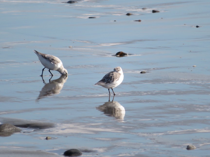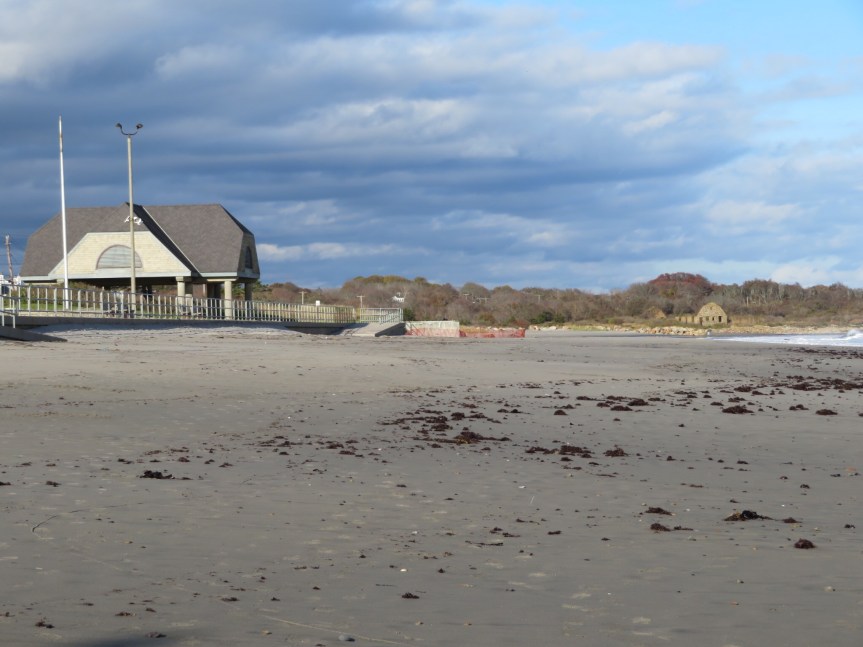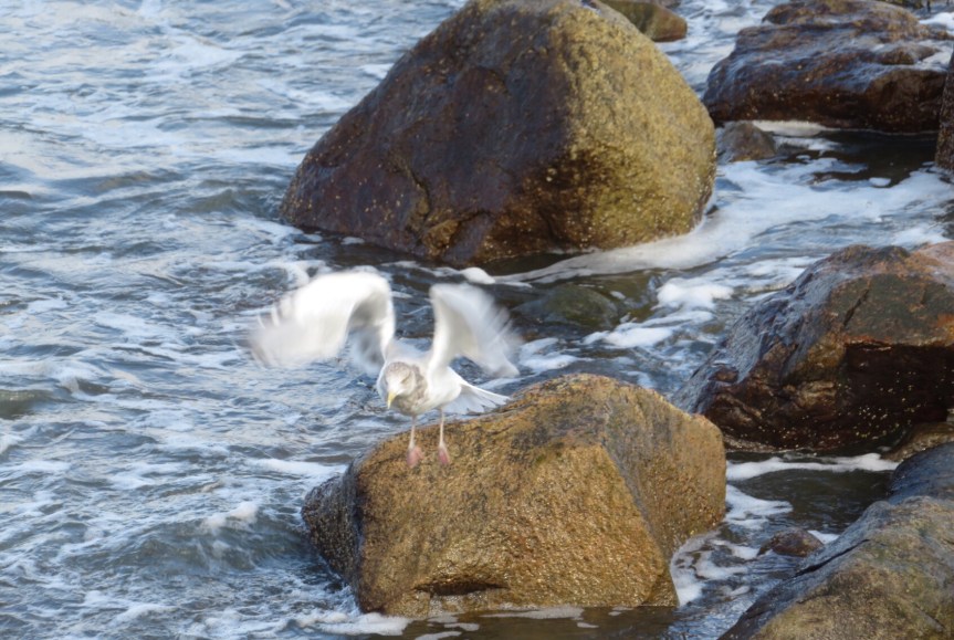 The next stop on our beach tour was the pavilion at Scarborough State Beach. Packed to the gills during the summer months, there was plenty of room in the sparsely populated parking lot today. We went for a long walk along the wide sandy beach. Flocks of rapidly running sandpipers were zipping along the waterline drilling down for whatever delicious delicacies they were finding beneath the sand. We continued on towards the ruins that sit on the piece of land that juts out from the end of the beach.