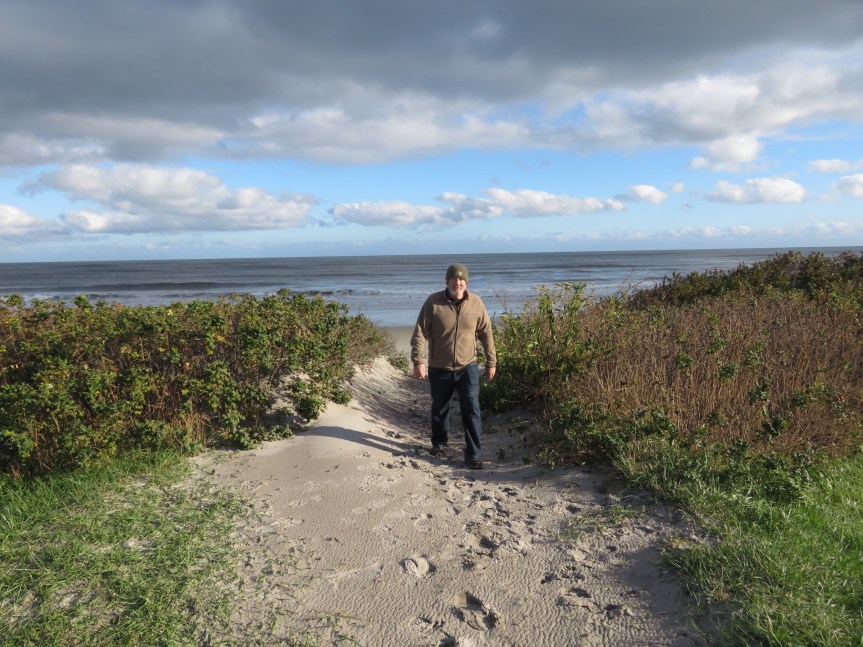 The landscape was gray and soggy as we emerged from the RV for Cali’s morning walk. The rain was over for the moment and the sun was beginning to sneak out from behind the rapidly moving clouds. Half of our front lawn area was underwater with little pools forming around the small trees along the entry road. The three of us took a long walk down by the water and through the nicer campsites in the lower loop. We were taking notes on which sites had the most privacy and space. On the return trip, I stopped in at the office and we upgraded to a full hookup spot down in loop 1. A nice dry site with pavement to park on to keep from tracking in mud and sand. The other benefit is that we can now take showers as often as we like since we can drain our water right here at the campsite. We got the rig all connected up then made a bite of lunch.