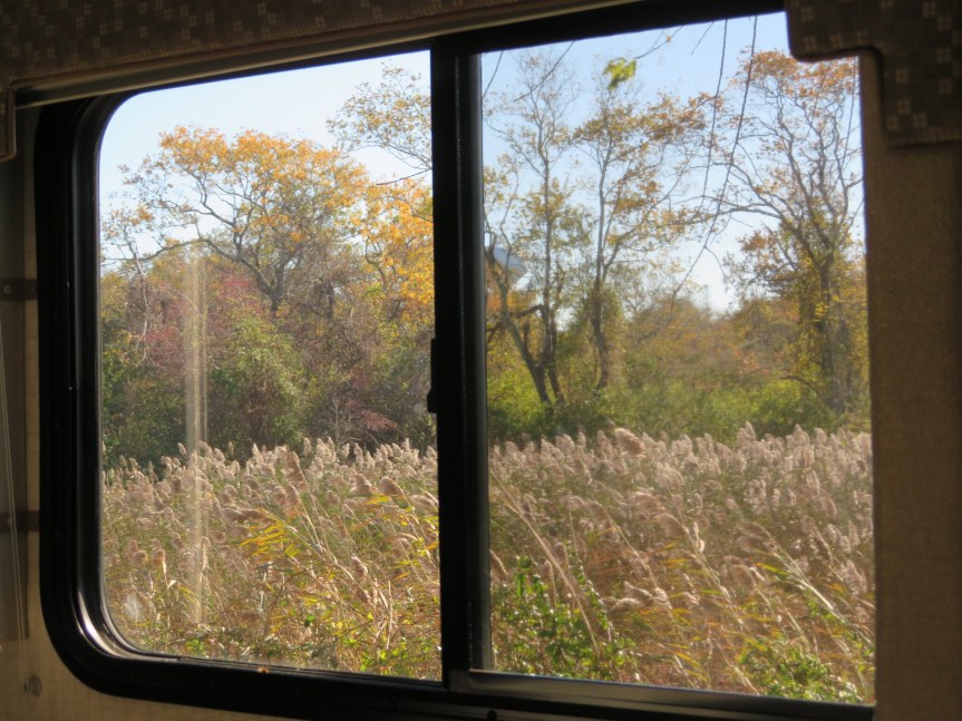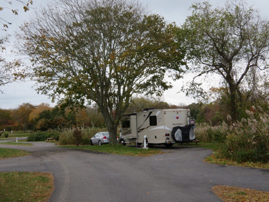 A steady rain began beating down on the roof in the early morning hours and continued unrelenting until about noon. High winds rocked the RV and the furry heads of the reedlike sea grass blew in waves outside the marsh side window. We had a low key day hanging around camp and occasionally getting some exercise walking Cali through the campground.