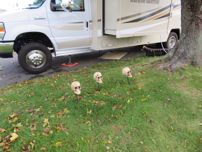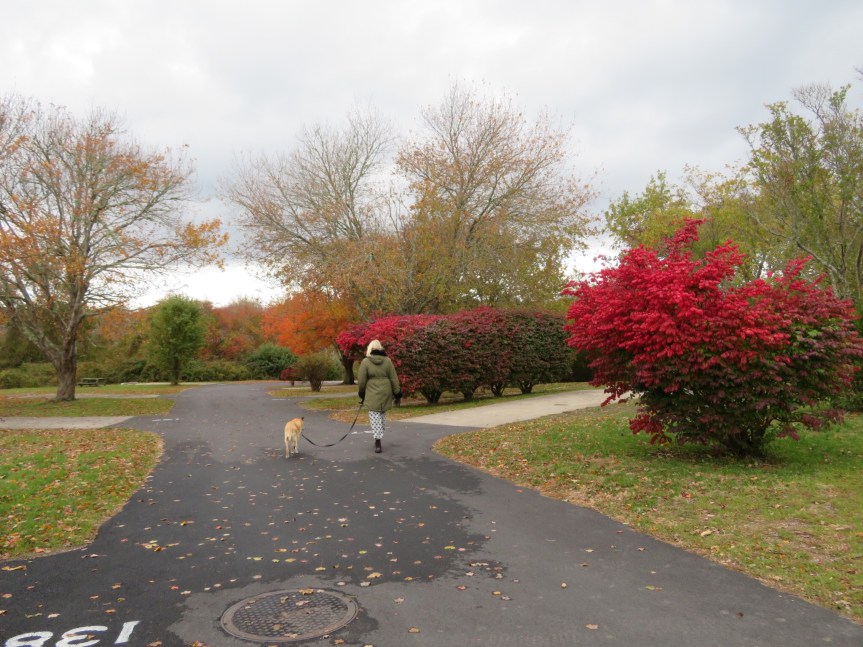 The sun made a brief appearance in the mid afternoon so we got out and stretched our legs again. This time we walked down by our old camp to see how it held up during the recent downpours. Only a few stray campers are left in the upper camp. Some of the sites flooded a bit more than the others. Cali seemed to enjoy sniffing around her old haunts and poking her nose in her favorite stand of berry bushes. I think there is a bit of deer scent in the thick foliage. Some threatening clouds were blowing quickly towards us, so we picked up the pace and walked briskly back to camp. Lazy day at Fisherman’s Memorial.