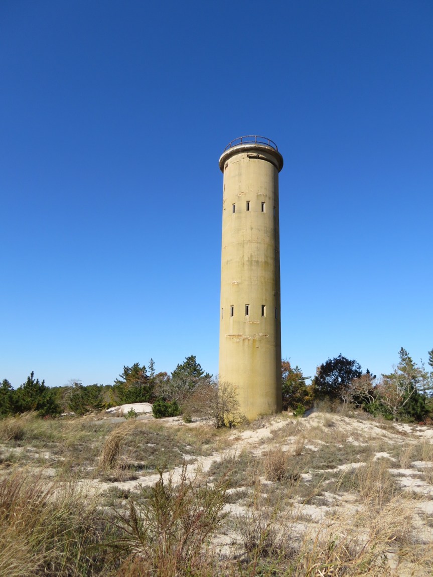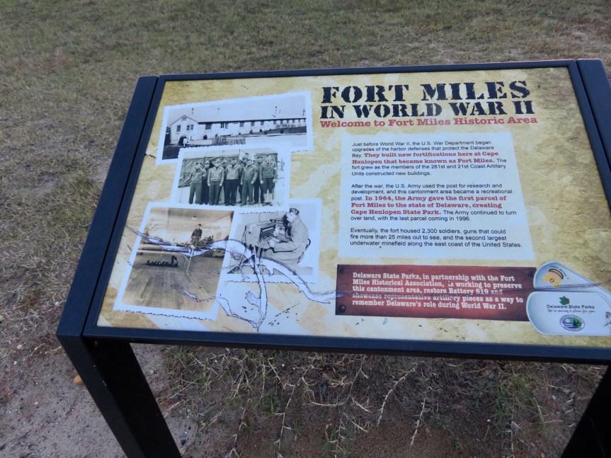 Cali and I were up early and slid out the door quietly to let PJ catch up on her sleep. We hiked north out the back end of the campground towards the point at Cape Henlopen. The sun had made an appearance this morning but the wind kept things crisp. We came upon Fort Miles, an old installation from World War II days. The signs said closed for remodeling, but we saw an intrepid jogger coming out so we ventured in. It was early on a chilly winter day and there was no one else stirring. Rows of old barracks and stands of old artillery were the attraction here. There are several tall spotting towers throughout the state park where soldiers used to watch for encroaching enemy boats. The federal government donated the base to the state of Delaware in the sixties and that is the land we are camping on, Cape Henlopen State Park.