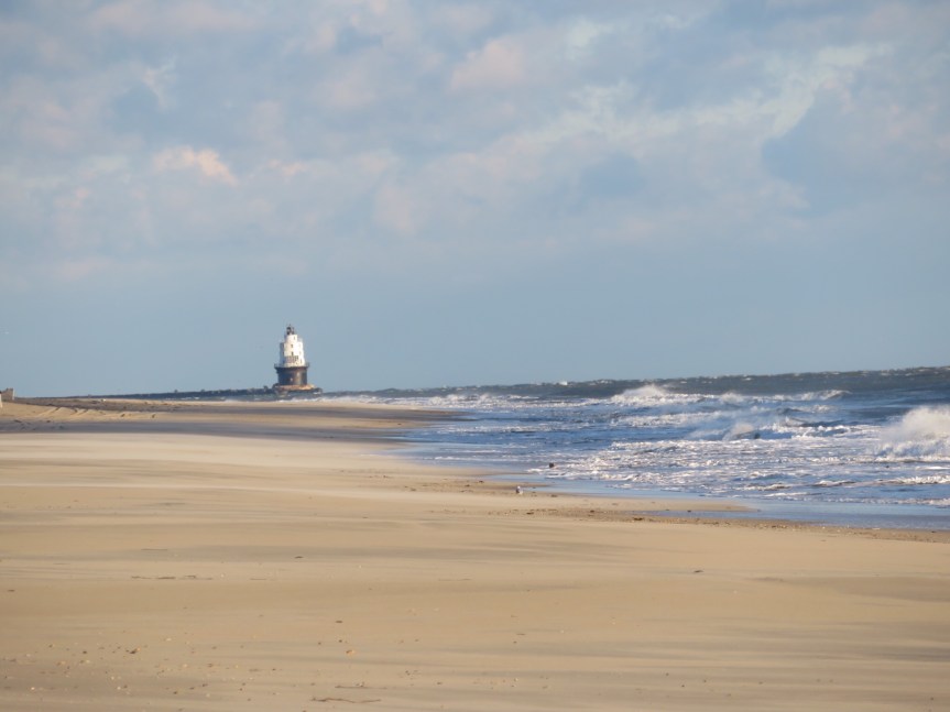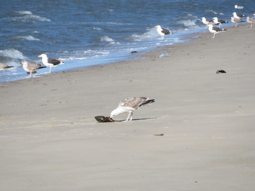 Outside the nature center there was a small trailhead going down to the bay side of the cape. We zipped up our jackets and trudged across the sandy expanse of scraggly pines and low shrubs until we came out at the windswept shores of Delaware Bay. Hard onshore winds held the seagulls suspended in flight and we had to lean in to keep from being bowled over. The lighthouse stood mournfully alone at the end of the long jetty. A few gulls were fighting over a small fish while others munched on the carcasses of stranded horseshoe crabs.