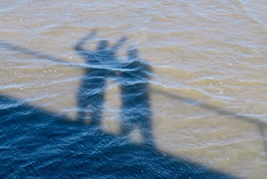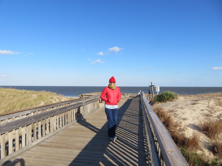 There was a long fishing pier jutting out into the bay that was inviting us to have a visit. It had a low chain link fence on both sides to encourage people to enter at the bait shack. There was no one around today, so we hopped the fence and strolled out onto the dock. We were having fun with the wind, jumping as high as we could to see if it would blow us down the planks and hiding our faces to keep from freezing. We walked back out to the road through the pier concession area and took the bike path to get back to the nature center.