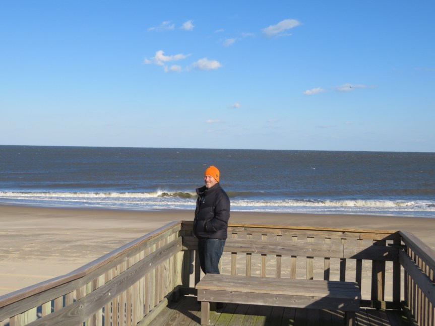 From there, we drove down to the swimming beach at the north end of the cape and walked down on the boardwalk to the sand. A few hearty souls were out enjoying the day. A family with a couple of young kids was playing around in the sand like it was a regular summer day. A girl with the reddest nose I’ve yet to see walked past quickly with her boyfriend hoping to find some warmth in the safety of the car to thaw herself out. We didn’t tarry long, PJ was starting to get chilled and Cali was at home waiting for us.