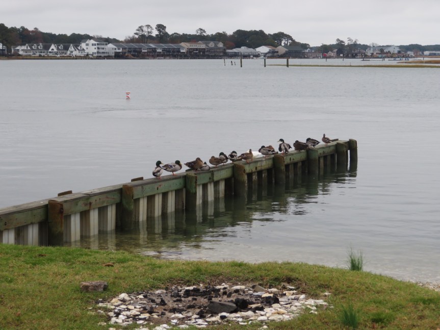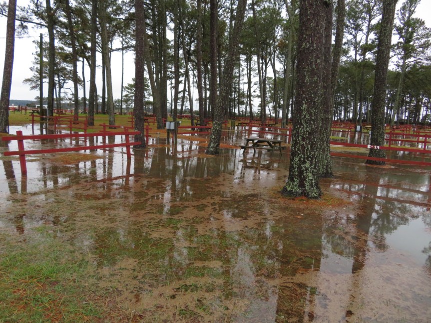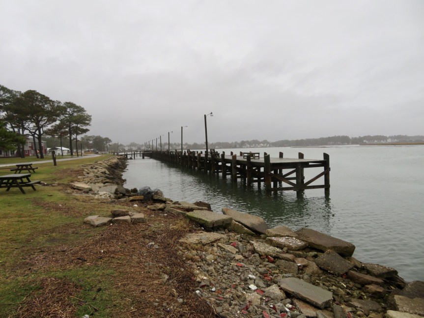 The rain finally started to let up mid morning so Cali and I went out and dodged the puddles to go have a look at Tom’s Cove. There are four other campers spread around the grounds with plenty of space between us. We walked down by the shuttered recreation building and walked out on one of the docks lined with benches facing the island so that on a lucky day, you might get a glimpse of a wild pony munching the marsh grass across the water.