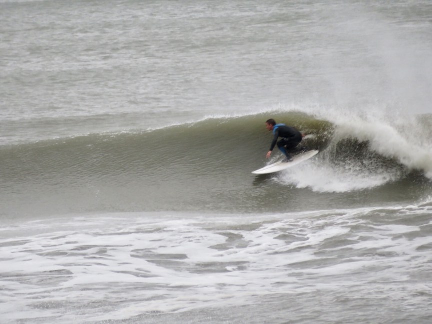 The road ends at the Atlantic and today there was a bit of a swell rolling onto the sand bar of the shallow beach break. Offshore winds were grooming the sets as intrepid locals were braving the icy temperatures to catch a few decent waves. A crew of guys were watching, hooting and taking pictures while we pulled up our collars against the wind and stood on the dune watching.