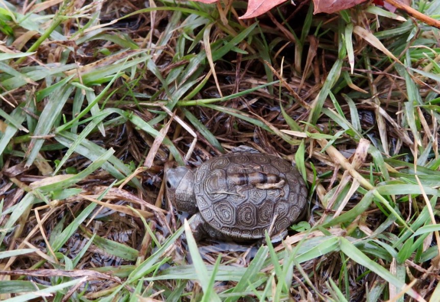 PJ got up and after breakfast we walked over to the office to rent our space for another night. Things in the office moved slowly but we got our spot and hiked over by the boat ramp and then back over by the docks. We scanned the far shore for ponies but to no avail. PJ spotted a baby turtle in the grass, a little snapper I think, and we moved him closer to the water. I had a long chat with our neighbor, Charlie, while PJ walked the balance beam of a narrow breakwater out into the bay.
