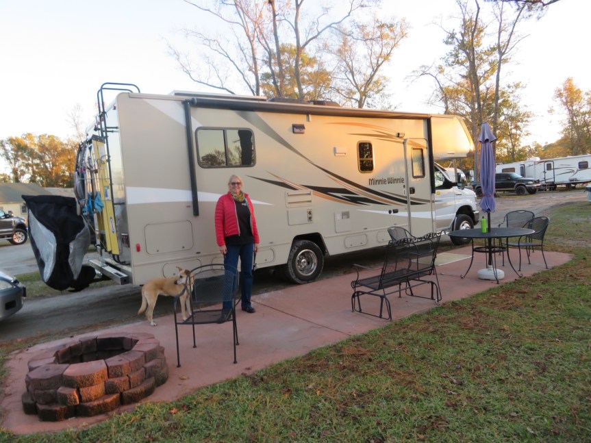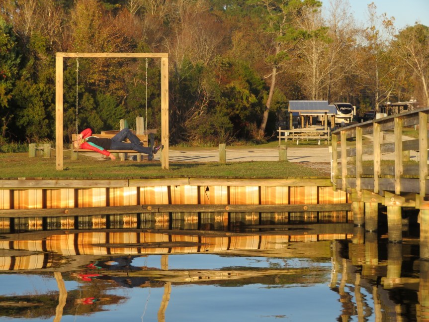 We returned to the dock area for an awesome sunset across the water. A few other campers were milling around enjoying the spectacle and relishing the warmer weather. We had a relaxing dinner and rested easy inside. PJ called a good friend of her father’s who lives here in New Bern to invite him out for breakfast, but he’s busy getting ready to hit the road to New York for Thanksgiving so we’ll have to catch up with him another time.