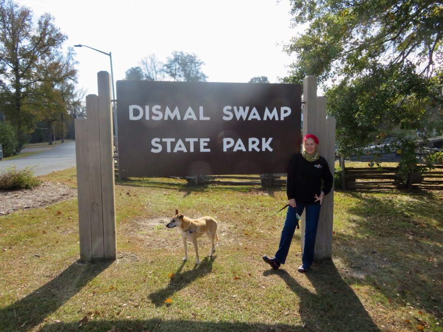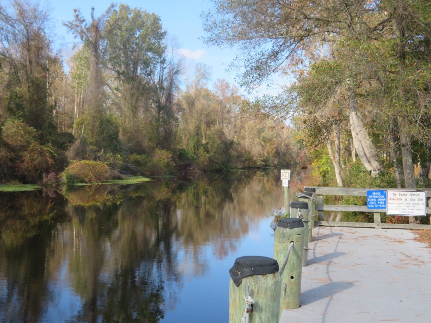PJ had been busy and the RV was pretty much ready to roll when I got back. A quick bowl of cereal and a few final details and we were on the road south heading for New Bern, NC. After about a half an hour on freeways, we ended up on smaller highways and two lane roads for the rest of the trip. We made a brief visit to the Dismal Swamp. Just the name made it worthy of a quick look. I had visions of the fire swamp from the Princess Bride. There was a boat dock on a wide expanse of bayou and a ramp with a rack of kayaks. This part of Virginia and North Carolina is extremely swampy. The highway through here is a raised bed of fill with submerged trees along both sides of the road.